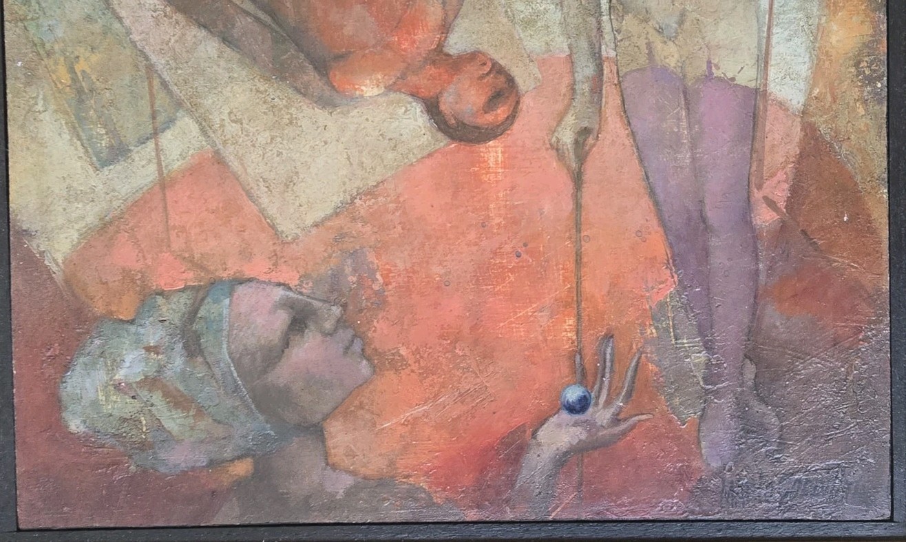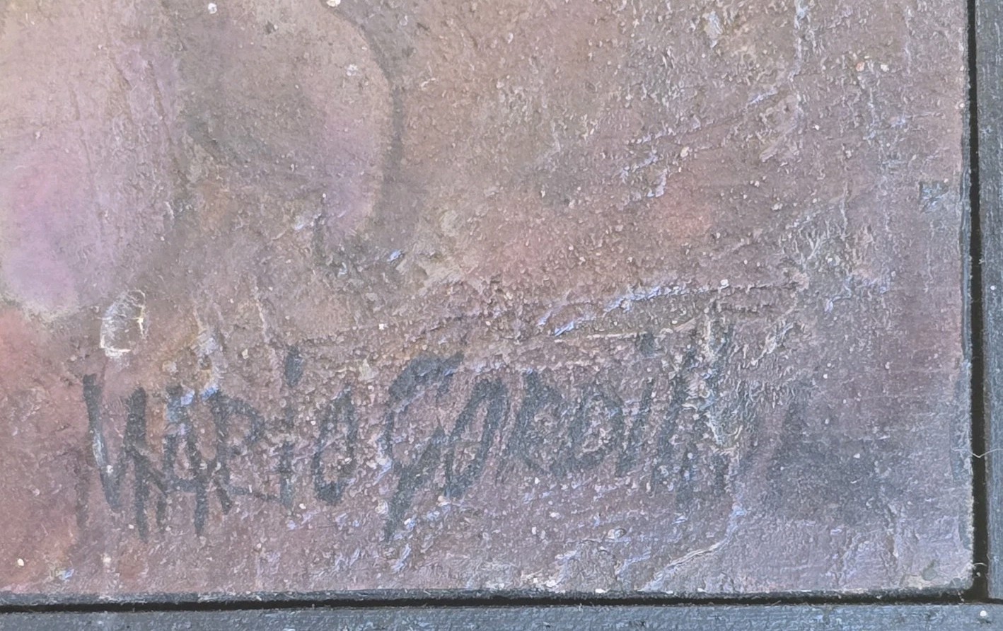 This rare signed Mario Gordillo untitled surreal art painting is a unique and one-of-a-kind piece from Ecuador. The painting is done on a Masonite board with oil, showcasing Gordillo's distinctive surrealist style. The artwork measures 12 by 11 inches. Frame measures 17 by 16 inches. It features figures as a subject and comes matted and framed, adding to its appeal as a captivating and collectible item for art enthusiasts. With its originality and signature by the artist, this painting is a valuable addition to any art collection.