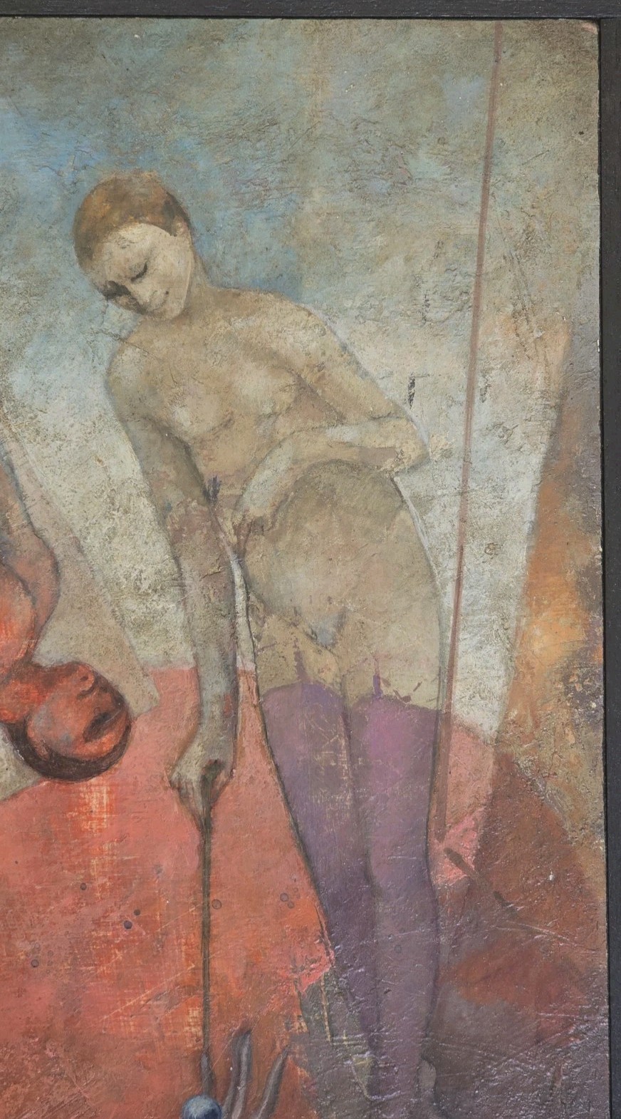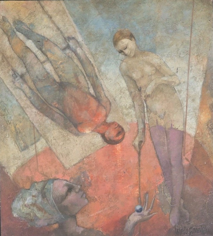 Mario Gordillo (1940-2022), Ecuadorian. Gordillo's paintings create a universe where reality and fantasy coexist. A subtle eroticism often permeates his works, which display harmony and skillful draftsmanship.