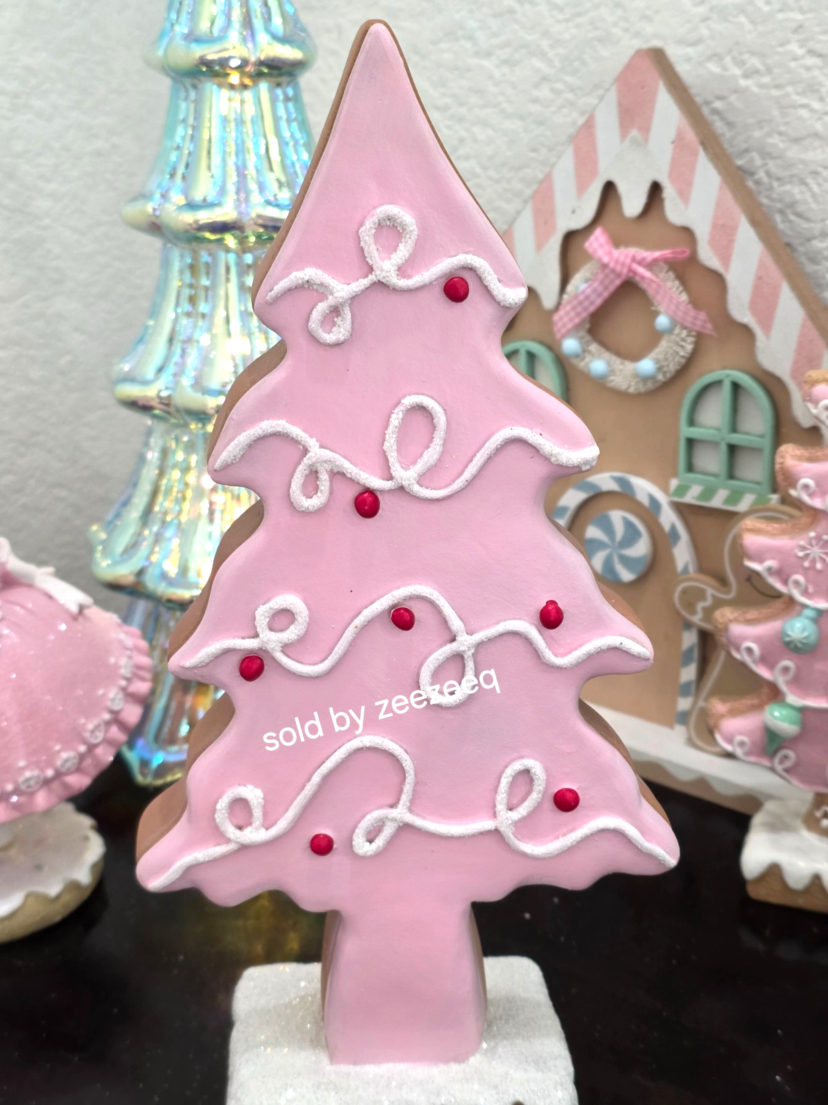 Up for sale we have this adorable gingerbread tree for your tabletop decor. The tree is made of resin and looks like a cookie. It has pink frosting with white design and red candy balls. It stands approx 12" tall. NEW. I have many gingerbread decor in my store.