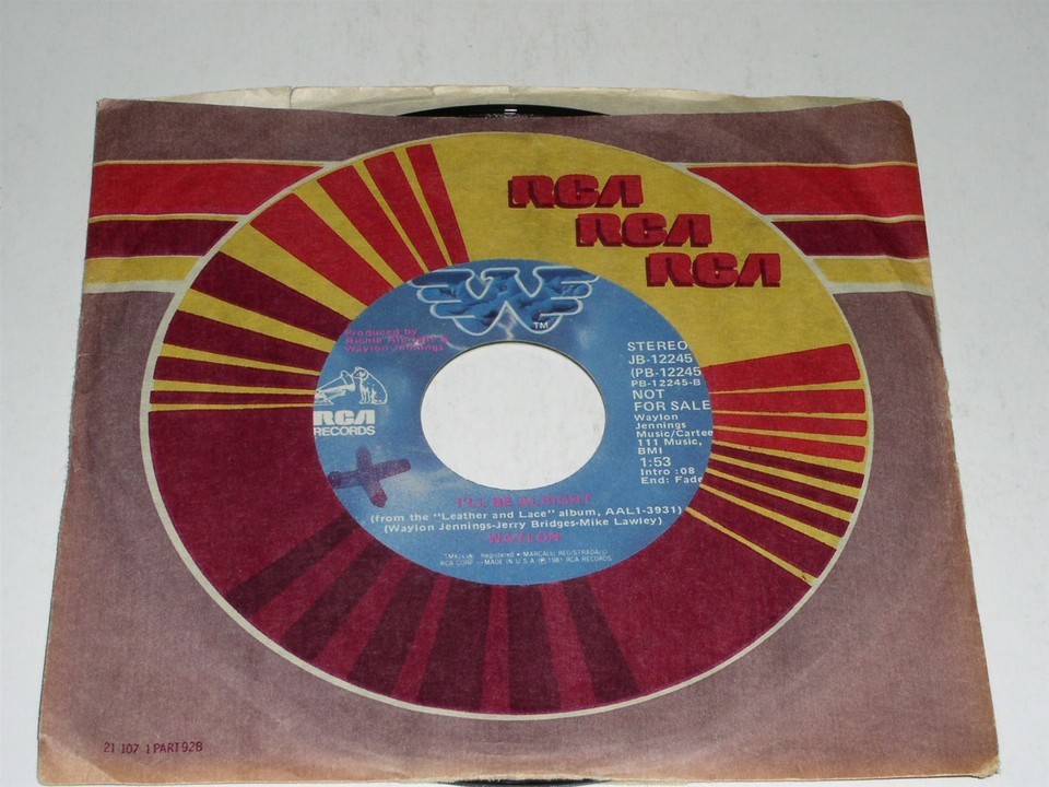 This is a vintage, rare promotional 45 rpm phonograph record by Waylon Jennings entitled, "I'll be Alright". Flipside: "Wild Side Of Life". Record label RCA JB-12245. Comes in the original RCA paper sleeve making this all the nicer.
