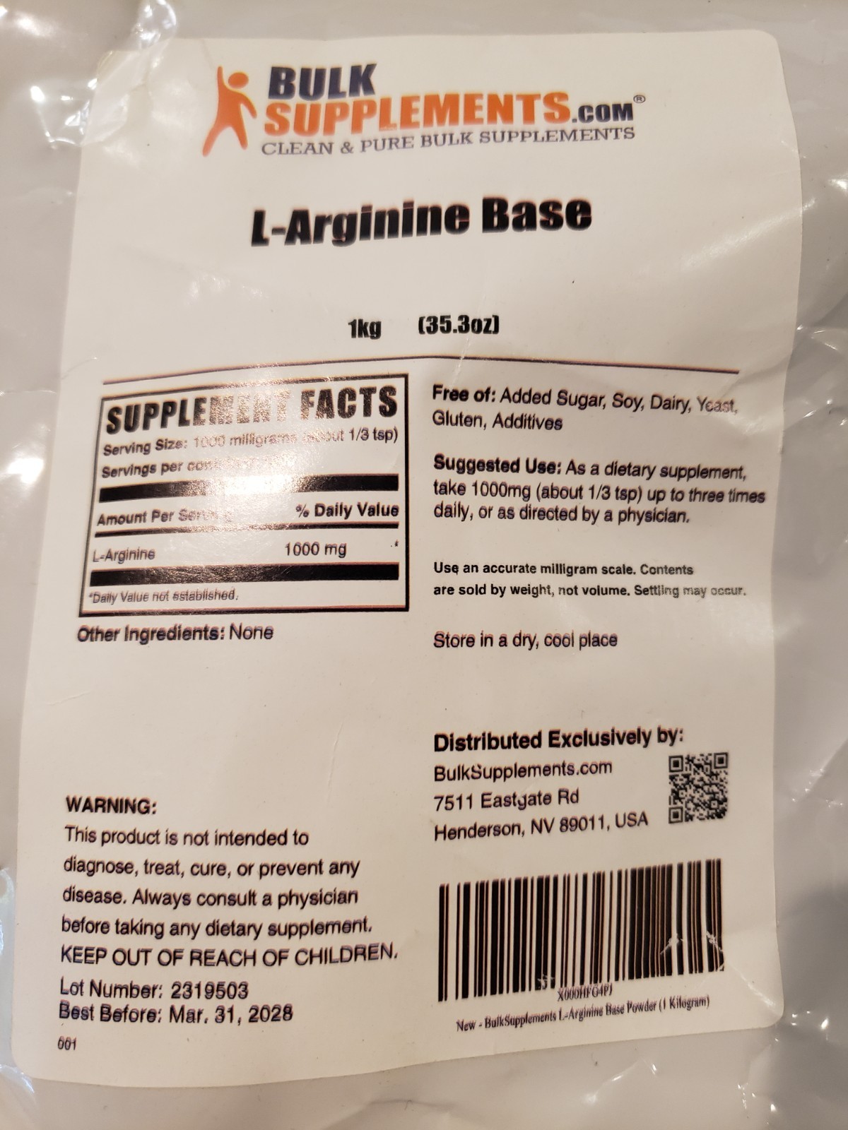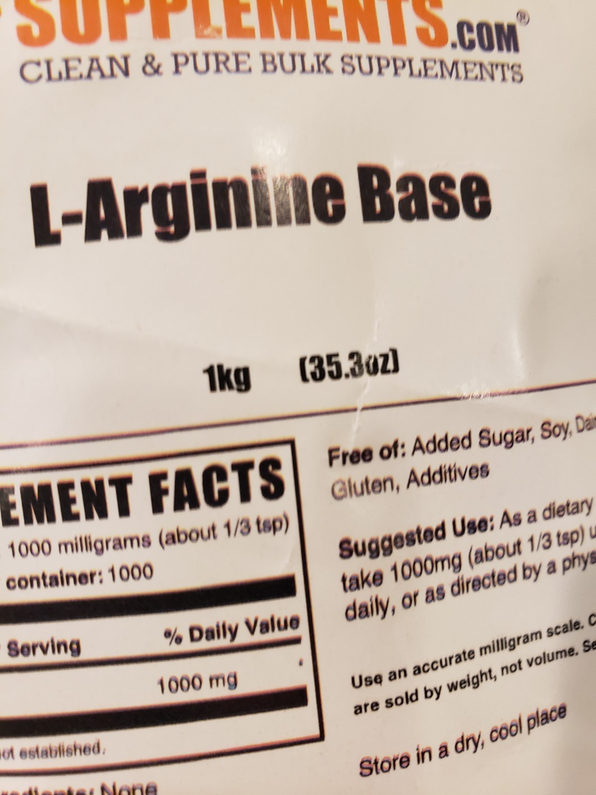 PURE L-ARGININE BASE POWDER by BULK SUPPLEMENTS - 2.2 POUND BAG (1kg)