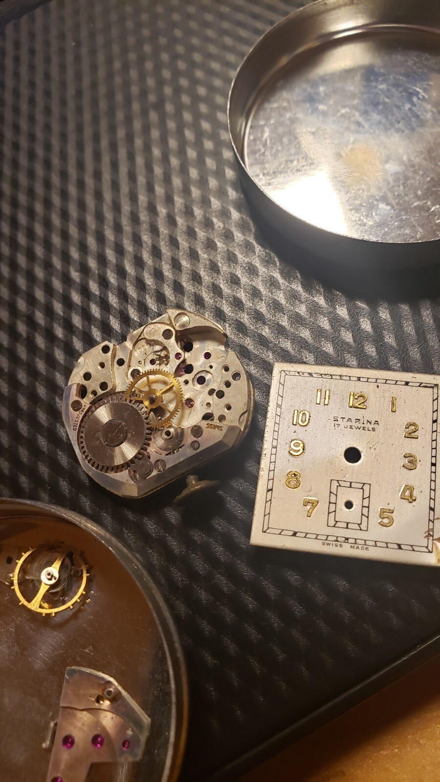 Vintage 1950's 60's Starina 17 Jewel Watch Tan w/ ETA Movement Gold hands gray I am not an expert on these. We got a huge supply off a watch maker that went out of business years ago. He had all these parts in this container and we are listing some. This is nice watch movement and inlay case here. Not sure where the rest of this is. But hopefully you can use this!!!! This should be good lot for watch maker / repairer. this may need to be cleaned up, but does not have scuffs or scratches Please check out my other vintage watch parts and crystal. we have lots of them and more to list. I will give deals on multi-orders!!!! FREE SHIP IN USA