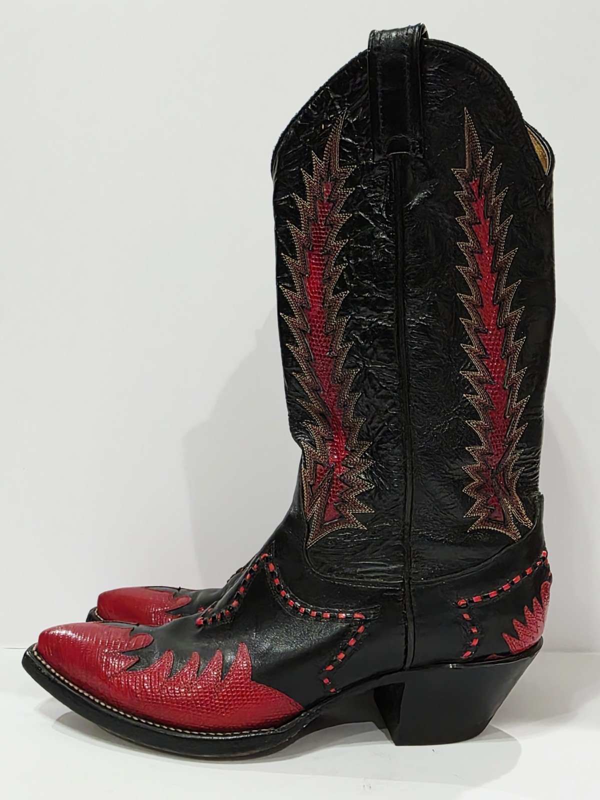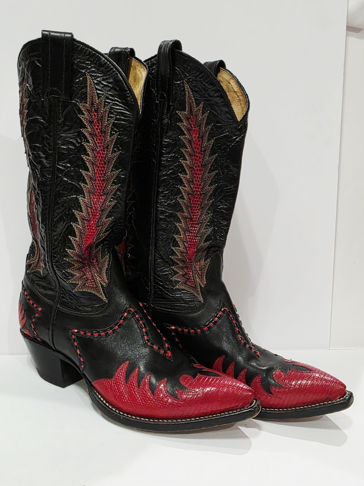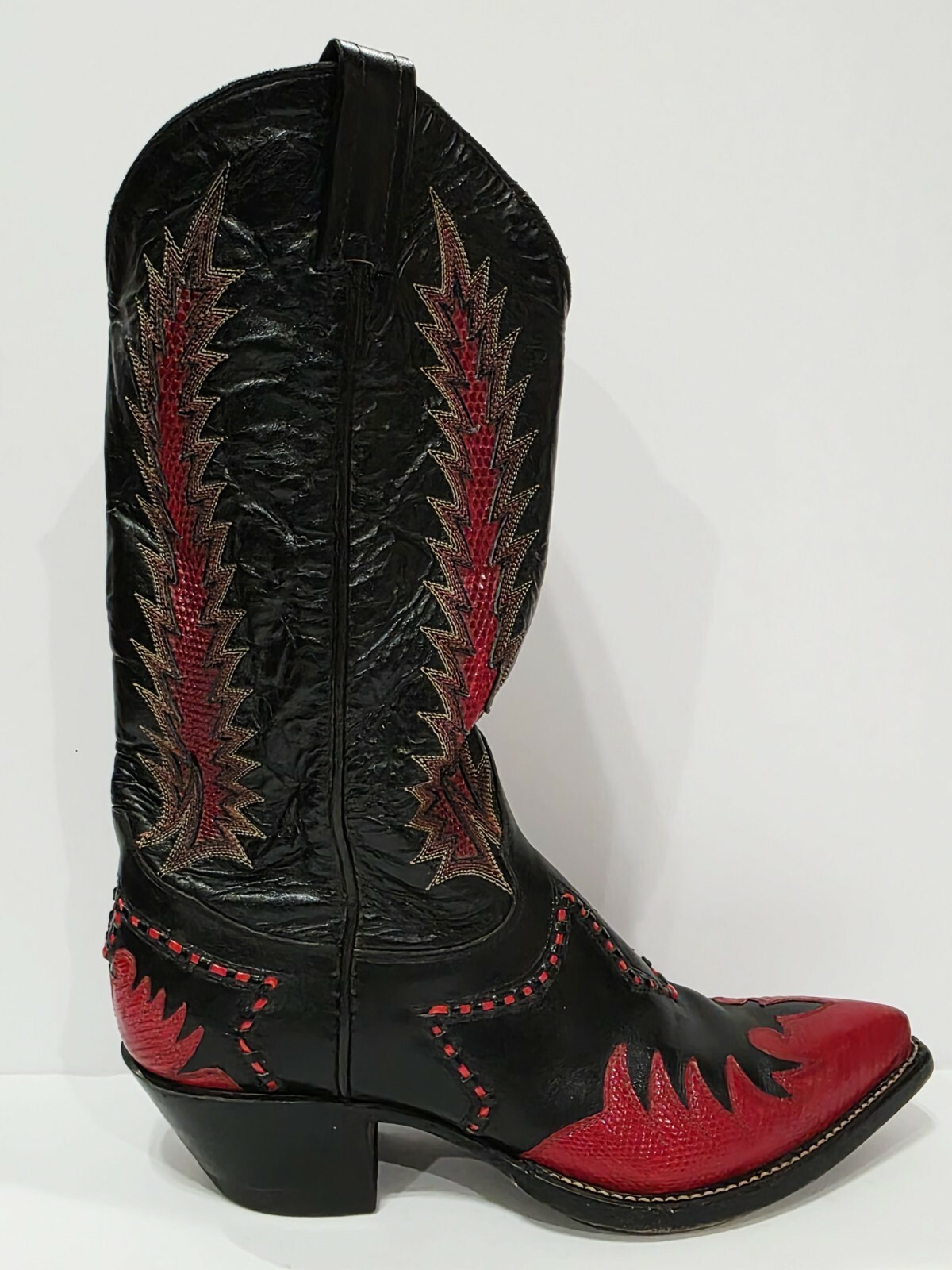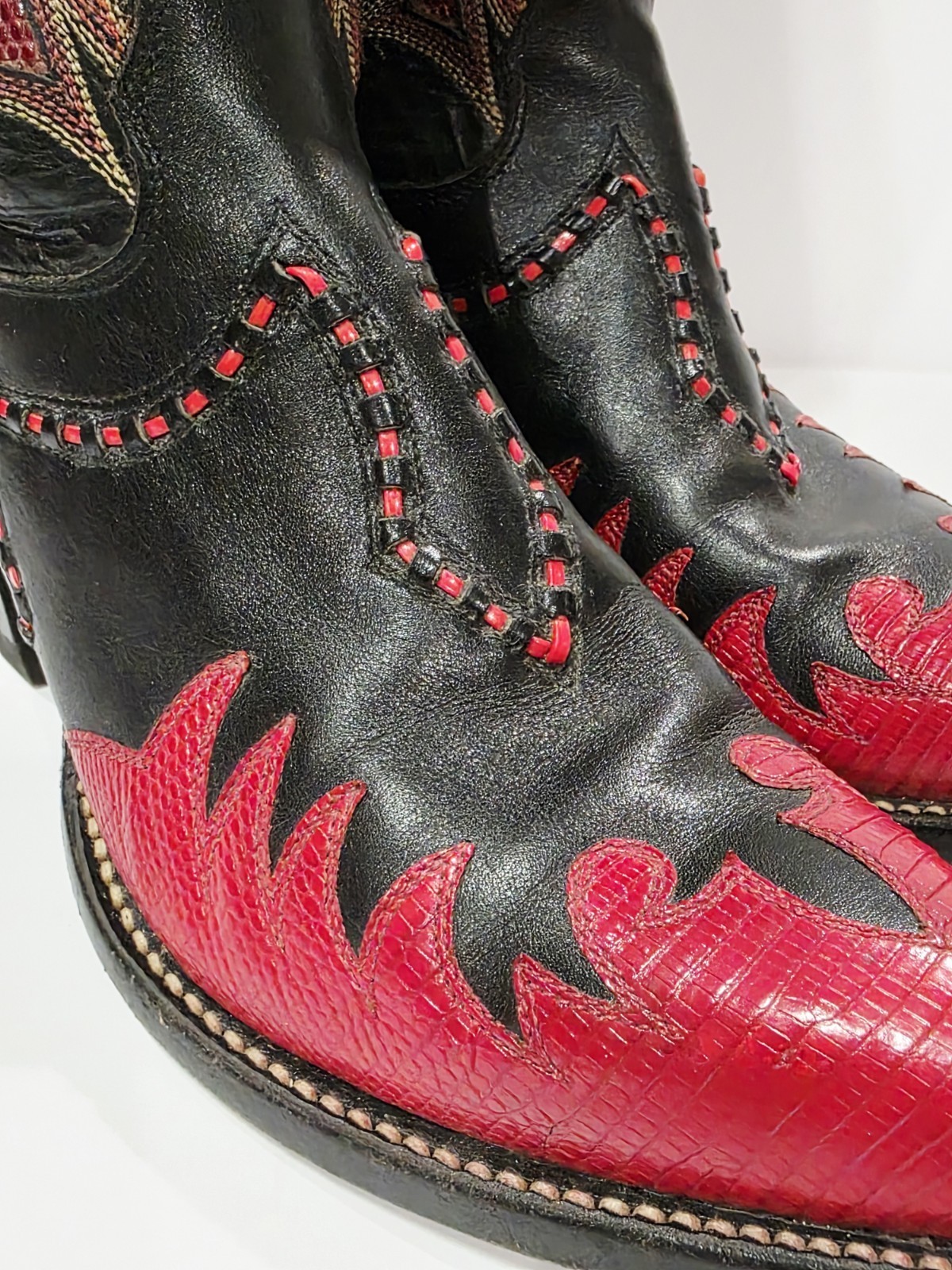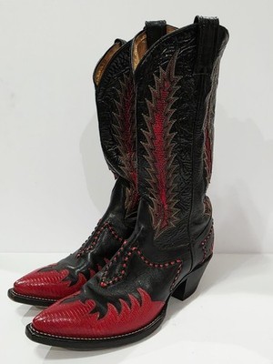 1 Used No Box Pair By Tony Lama X68536 RED FLAME Black Boot Leather Cowboy Western Embroidered Stitched Lizard Men 6.5 B Used! (Box #5)