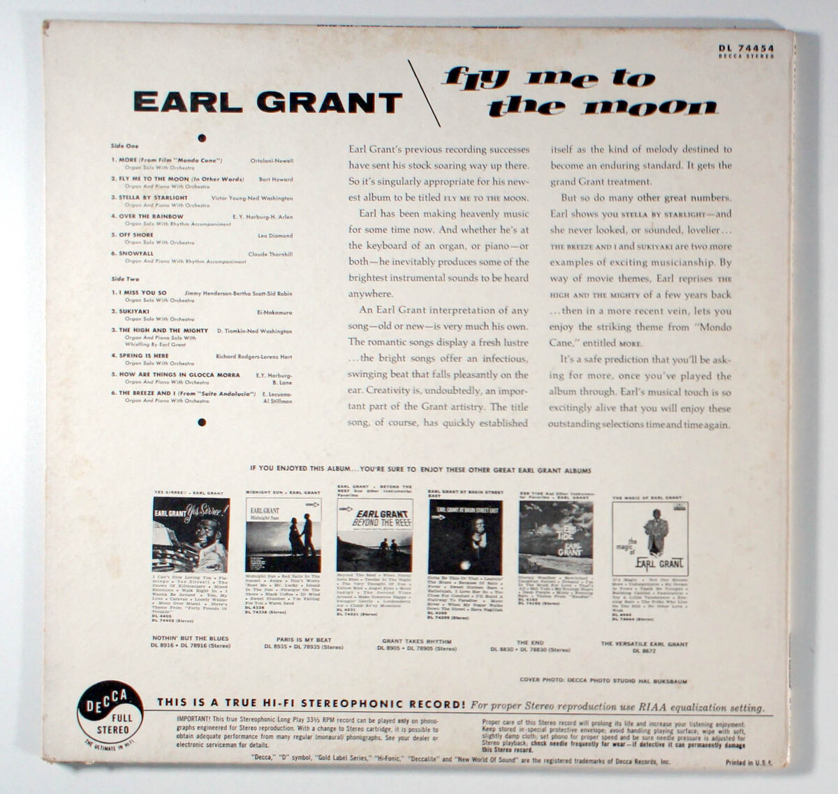 Fly Me to the Moon, a 1963 instrumental album by Earl Grant, released on Decca Records, features a collection of easy listening jazz standards and popular songs performed on piano and Hammond organ. The album includes tracks like More, Stella by Starlight, Over the Rainbow, Sukiyaki, and the title track Fly Me to the Moon, reflecting Grants smooth, lounge-style interpretations popular in the early 1960s. Historically, it underscores Grants role as a pioneering African American artist who broke racial barriers on shows like The Ed Sullivan Show, contributing to the eras instrumental music trend during the space races cultural peak. The album reached No. 139 on the Billboard charts, building on Grants success from his 1961 gold-certified album Ebb Tide and his 1958 hit single The End, which peaked at No. 7 on the Hot 100. The title track resonated widely due to its timely connection to space exploration.