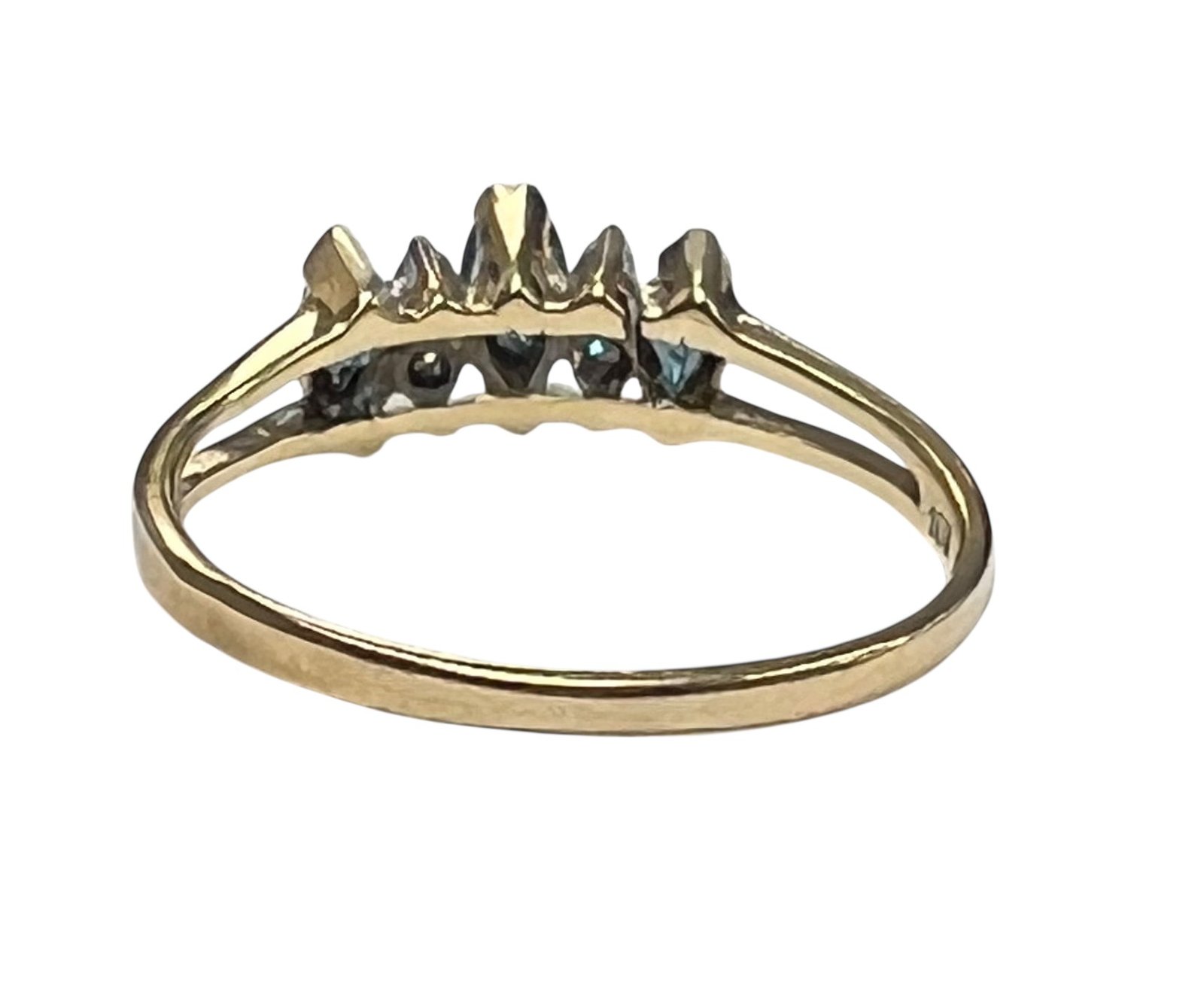 Type: Cluster ringWeight: .7Karat: 10ktMetal: Yellow GoldGender: Women'sStyle: ClusterSize / Length: 4.5Owner applied: 10KTStone 1 quantity: 3Stone 1 shape: OvalStone 1 color: BlueStone 1 weight (total): .25Stone 2 Quantity: 4Stone 2 Shape: RoundStone 2 Color: ClearStone 2 Weight (Total): .04Stone 2 Type: DiamondStone 1 type: SapphireCondition:Used