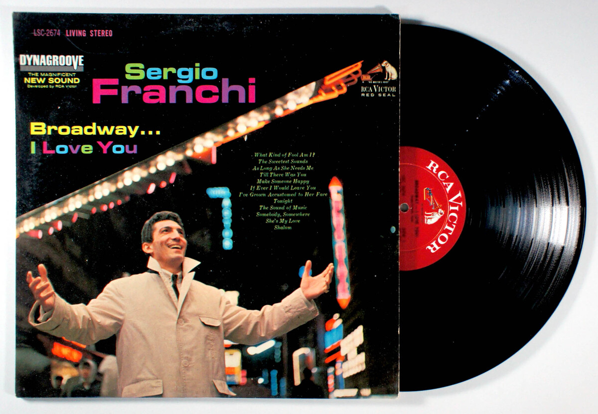Broadway...I Love You, by Sergio Franchi, is a 1963 studio album by the Italian-American, released by RCA Victor as his third full-length recording in the United States following his breakthrough success with Romantic Italian Songs. The album features Franchi's interpretations of popular Broadway show tunes from musicals such as West Side Story, Oliver!, Camelot, and My Fair Lady, including tracks like Tonight, As Long As She Needs Me, If Ever I Would Leave You, and I've Grown Accustomed to Her Face. Historically significant as part of Franchi's strategic shift from classical and Italian repertoire to the pop marketmarked by his move from RCA's Red Seal label to the mainstream Black labelthis release helped solidify his crossover appeal in the U.S. during the early 1960s, a period when he was gaining fame through television appearances and live performances. The album peaked at No. 103 on the Billboard 200 chart, contributing to a prolific year for Franchi that saw three of his LPs charting simultaneously. Notably, Franchi did not release any hit singles from the album, as his career emphasis remained on album sales and concert touring rather than standalone 45s