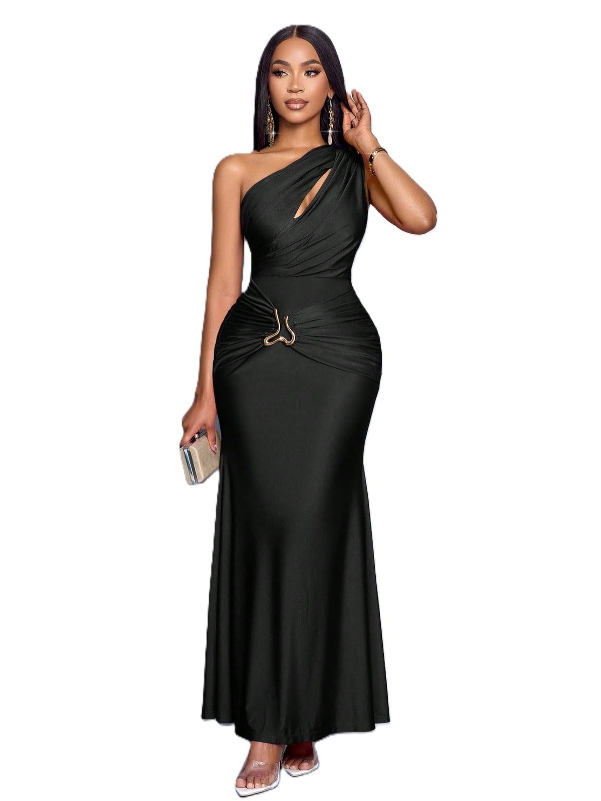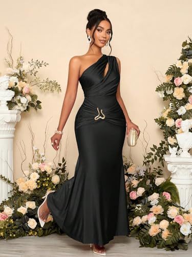 Product description: Make a stunning entrance in this sophisticated maxi dress by TRENDY TRON. Featuring an eye-catching asymmetrical neckline and sleek bodycon silhouette, this dress combines modern elegance with timeless appeal. The high-waist design and mermaid hem create a flattering silhouette, while the medium-stretch fabric blend of 88% polyester and 12% elastane ensures both comfort and a perfect fit. Available in versatile colors including Black, Blue, Khaki, Purple, Red, and Olive Green, this sleeveless dress is adorned with metallic accents and a zipper detail that adds contemporary flair. The slim fit and maxi length make it an ideal choice for weddings and special occasions. The unlined body allows for easy movement, while the plain pattern provides a sophisticated canvas for accessorizing. Complete your look with statement jewelry and heels for an ensemble that embodies modern refinement.