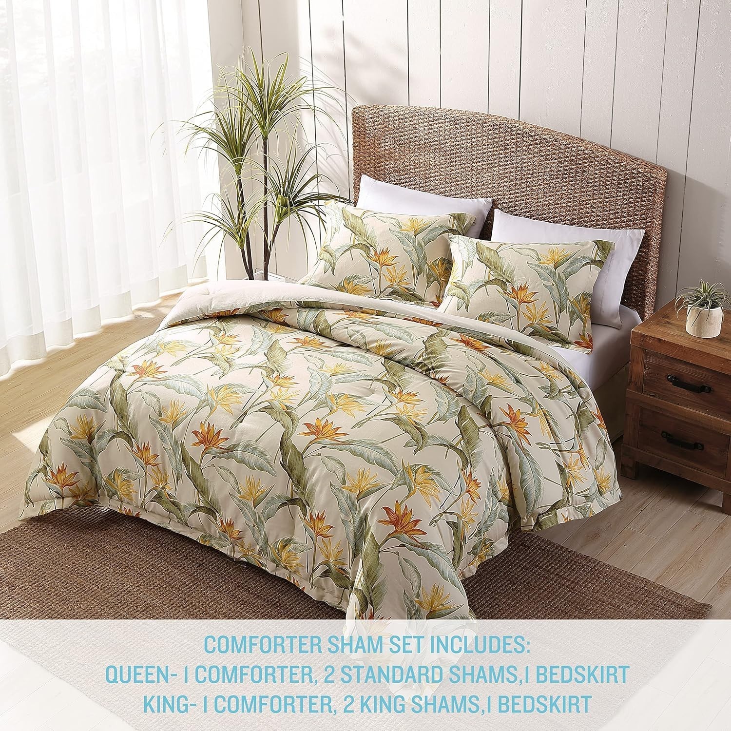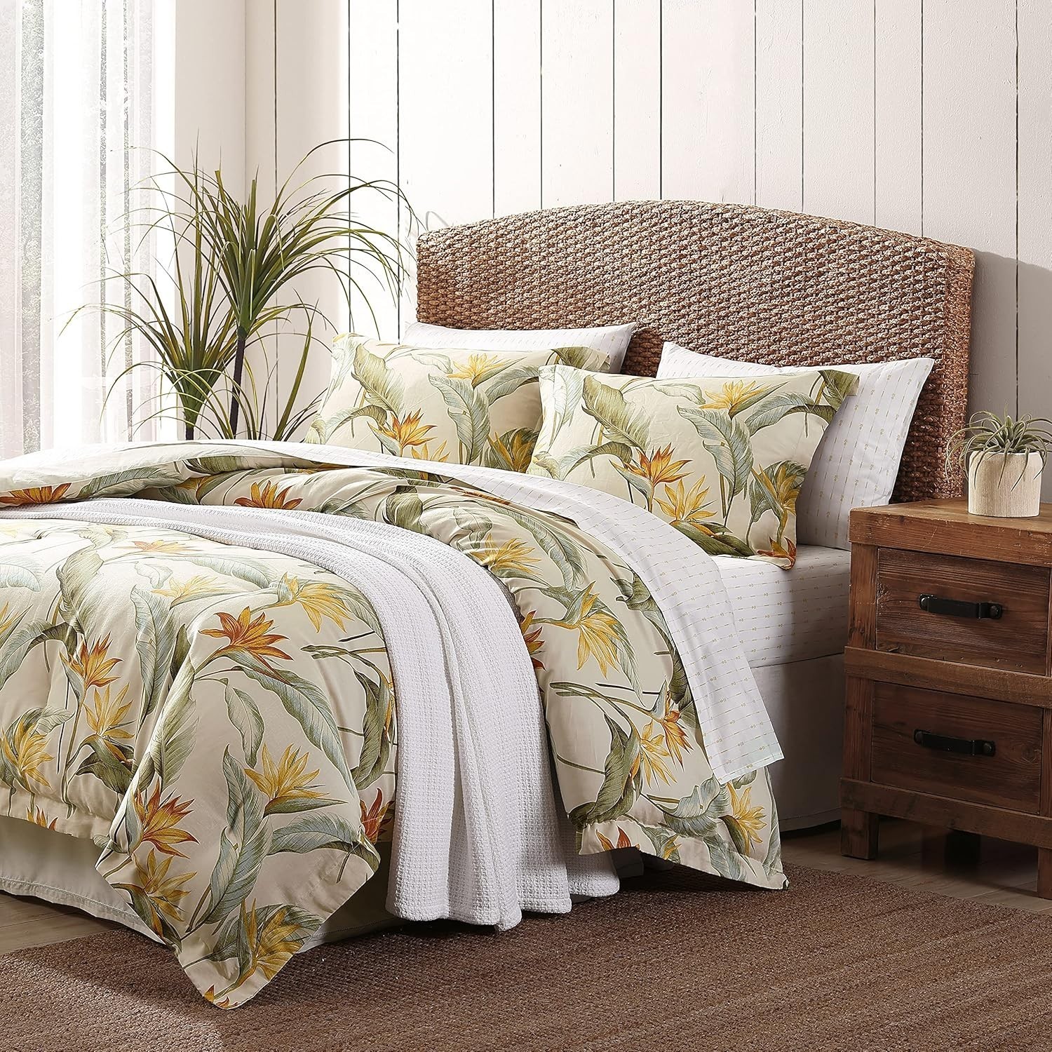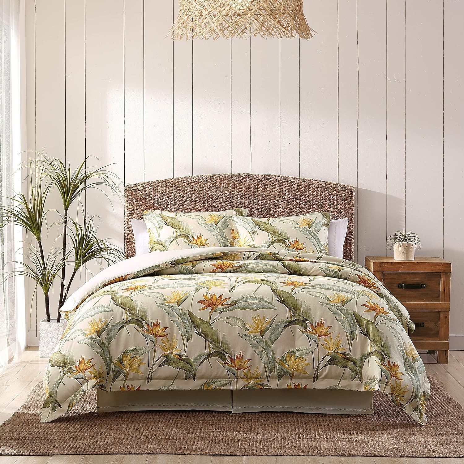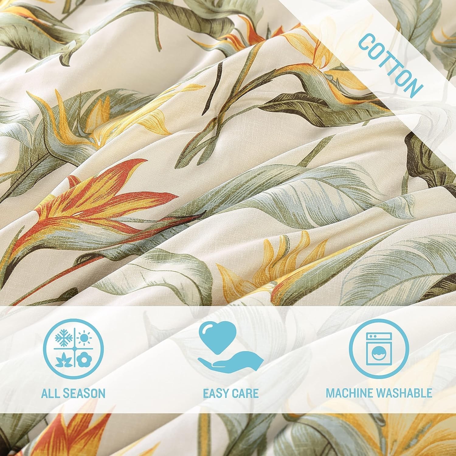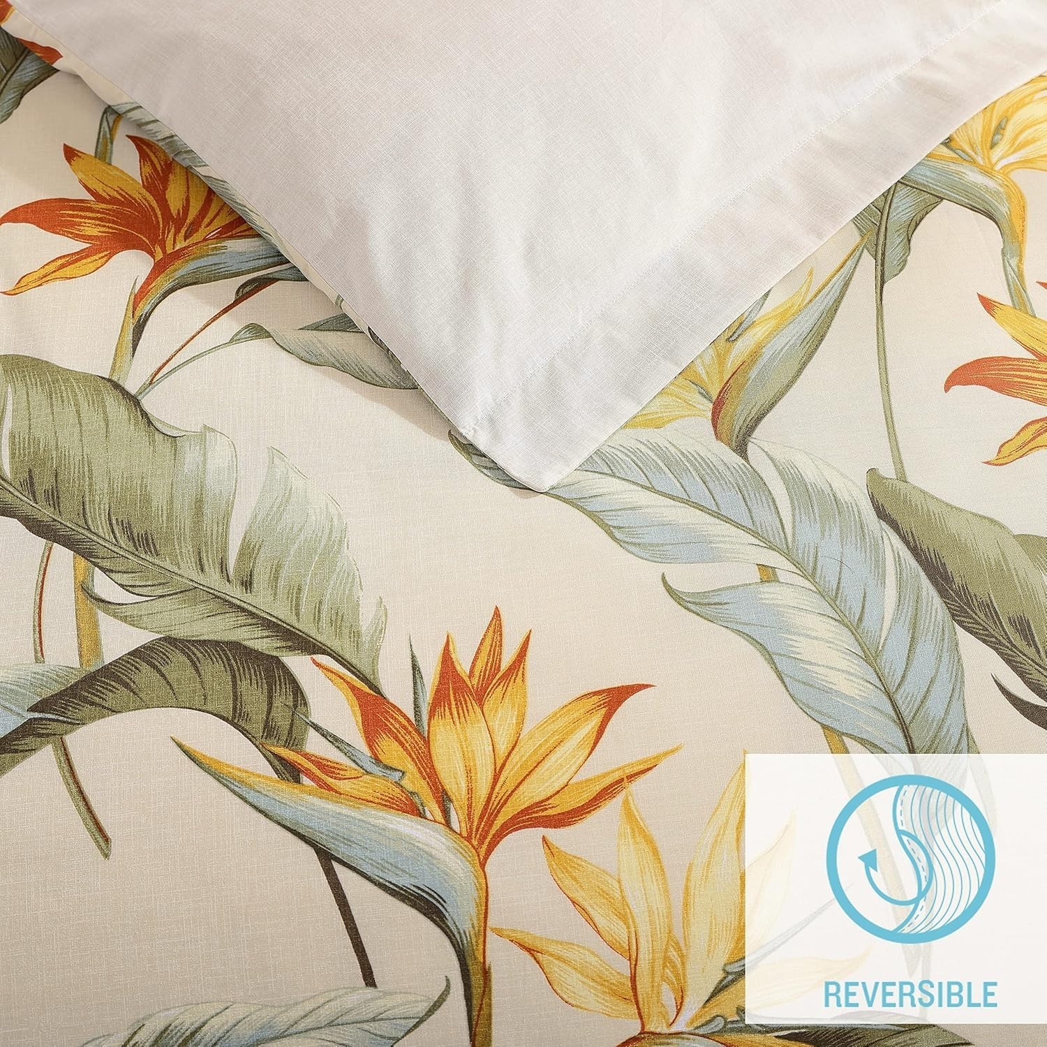 DESIGN: Beautiful Tropical Florals of yellow and orange with livable greens leaves come together on an ivory comforter; With a textured print reverse