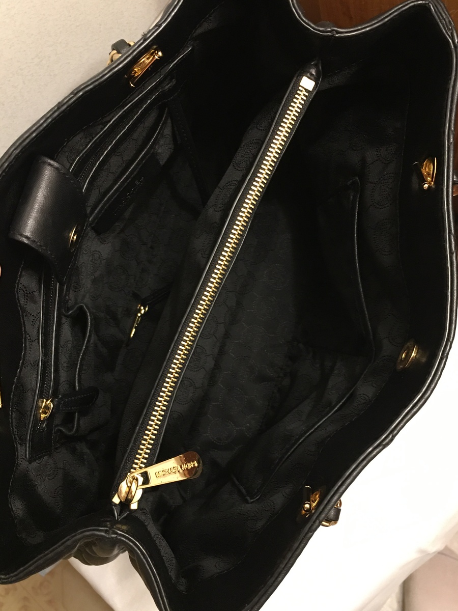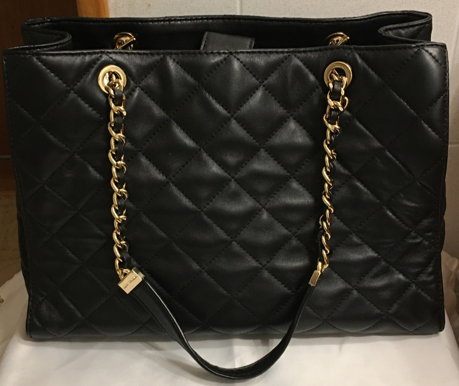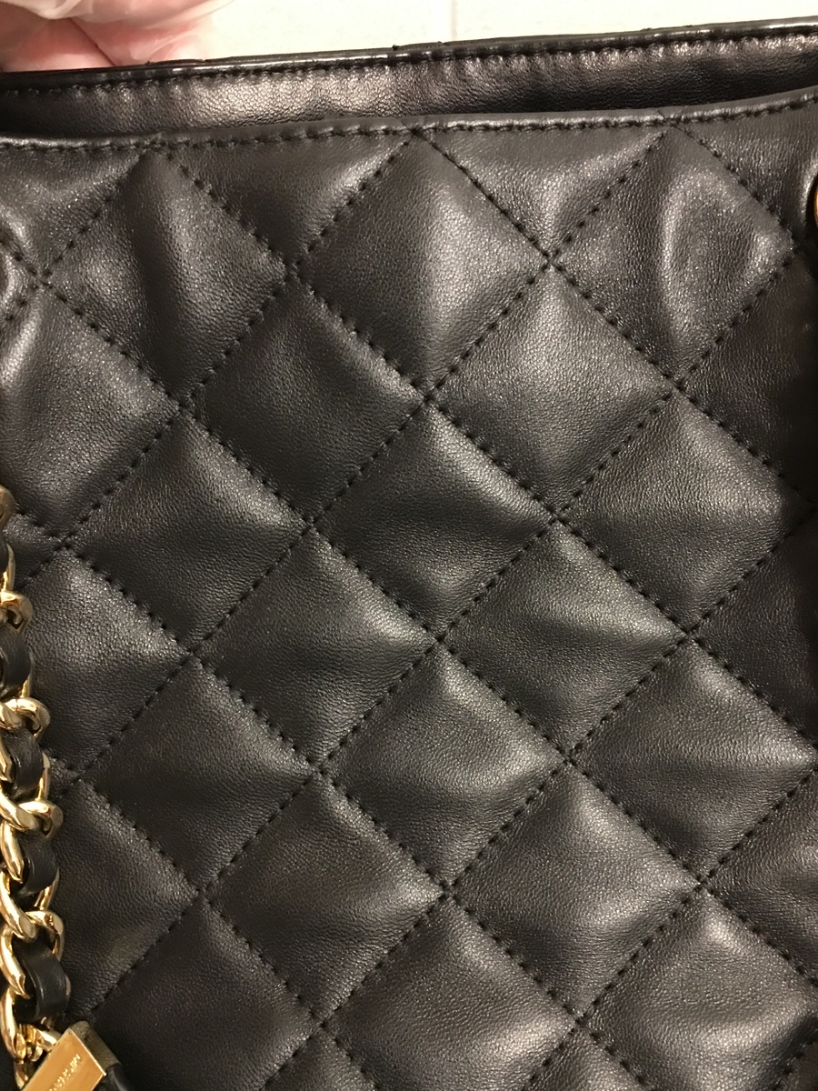 This gorgeous classic black leather quilted Chanel-style bag, also known as "susannah" from designer Michael Kors. Quilted leather tote has no tears or marks on outside, bottom or inside bag. Inside is roomy with 3 different areas (one of which is zipped for safety/privacy), an inside smaller zip compartment for lipstick, keys, etc, Interior has snap button closure. Bottom of bag has gold feet to keep it protected. Woven leather + gold hardware chain is styled like classic Chanel bags. It will fit over the shoulder.The gold MK medallion was taken off but i still have it. Its buyers choice if they would like to have it taken somewhere to connect it back on the gold d-ring. I left the d-ring for options to attach on it.