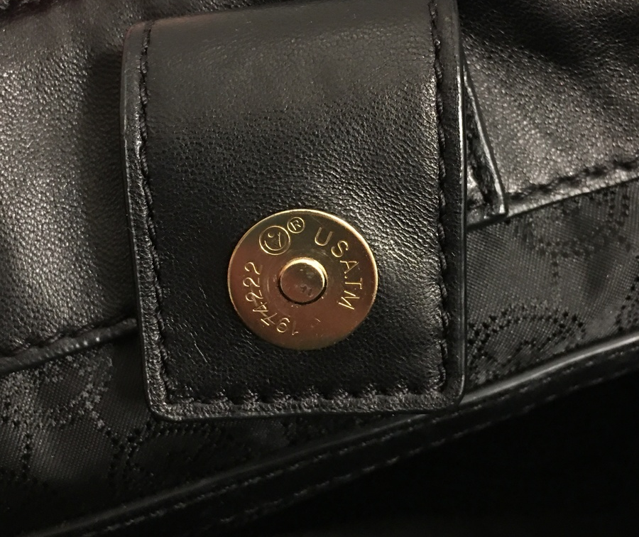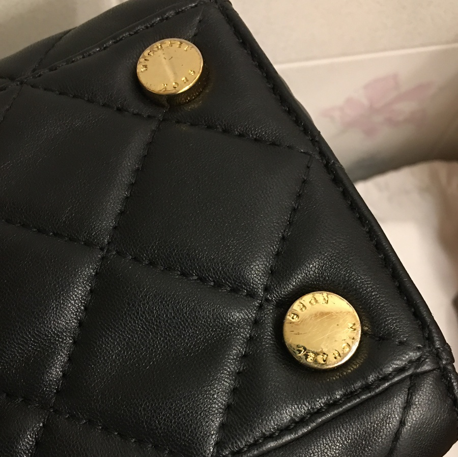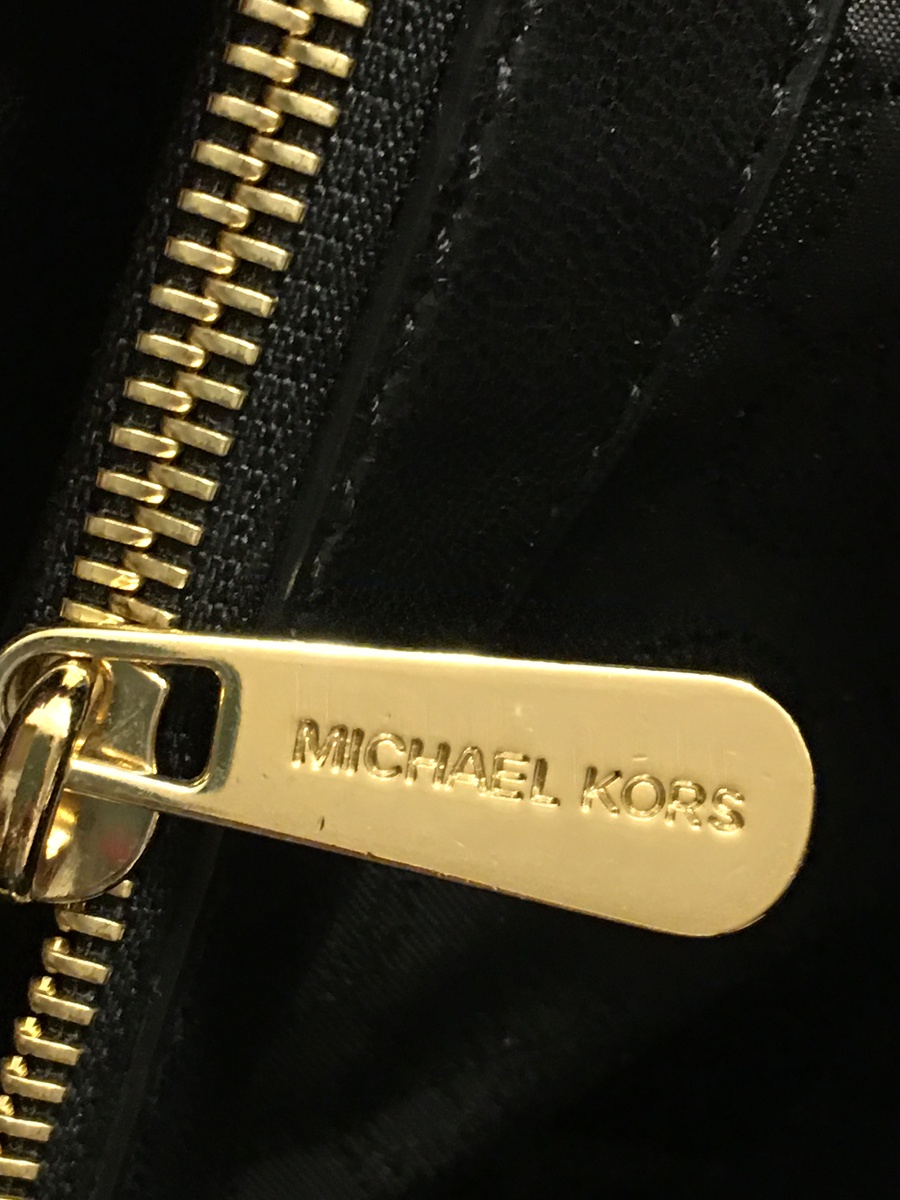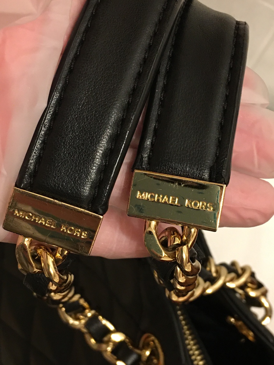 This gorgeous classic black leather quilted Chanel-style bag, also known as "susannah" from designer Michael Kors. Quilted leather tote has no tears or marks on outside, bottom or inside bag. Inside is roomy with 3 different areas (one of which is zipped for safety/privacy), an inside smaller zip compartment for lipstick, keys, etc, Interior has snap button closure. Bottom of bag has gold feet to keep it protected. Woven leather + gold hardware chain is styled like classic Chanel bags. It will fit over the shoulder.The gold MK medallion was taken off but i still have it. Its buyers choice if they would like to have it taken somewhere to connect it back on the gold d-ring. I left the d-ring for options to attach on it.