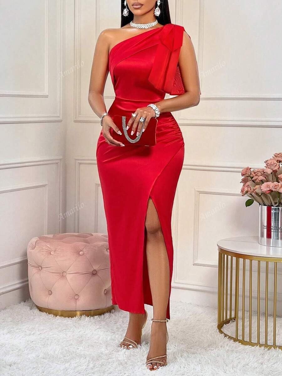 Women's Long Elegant Dress, Red, Multiple Sizes, Formal & Wedding, Fitted, Asymm