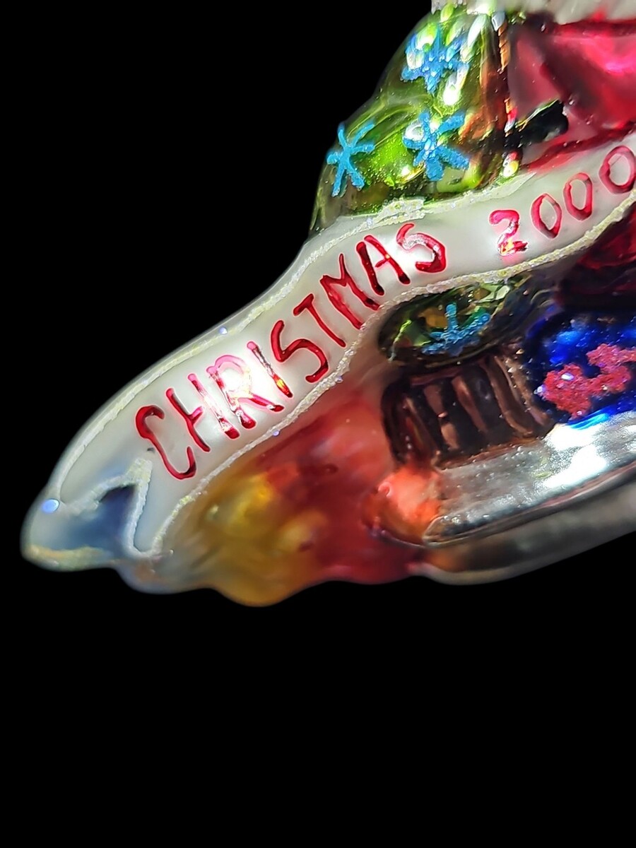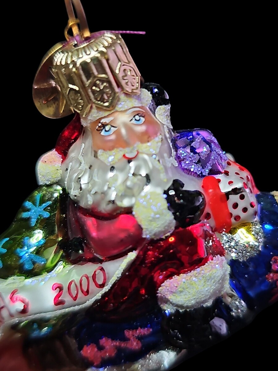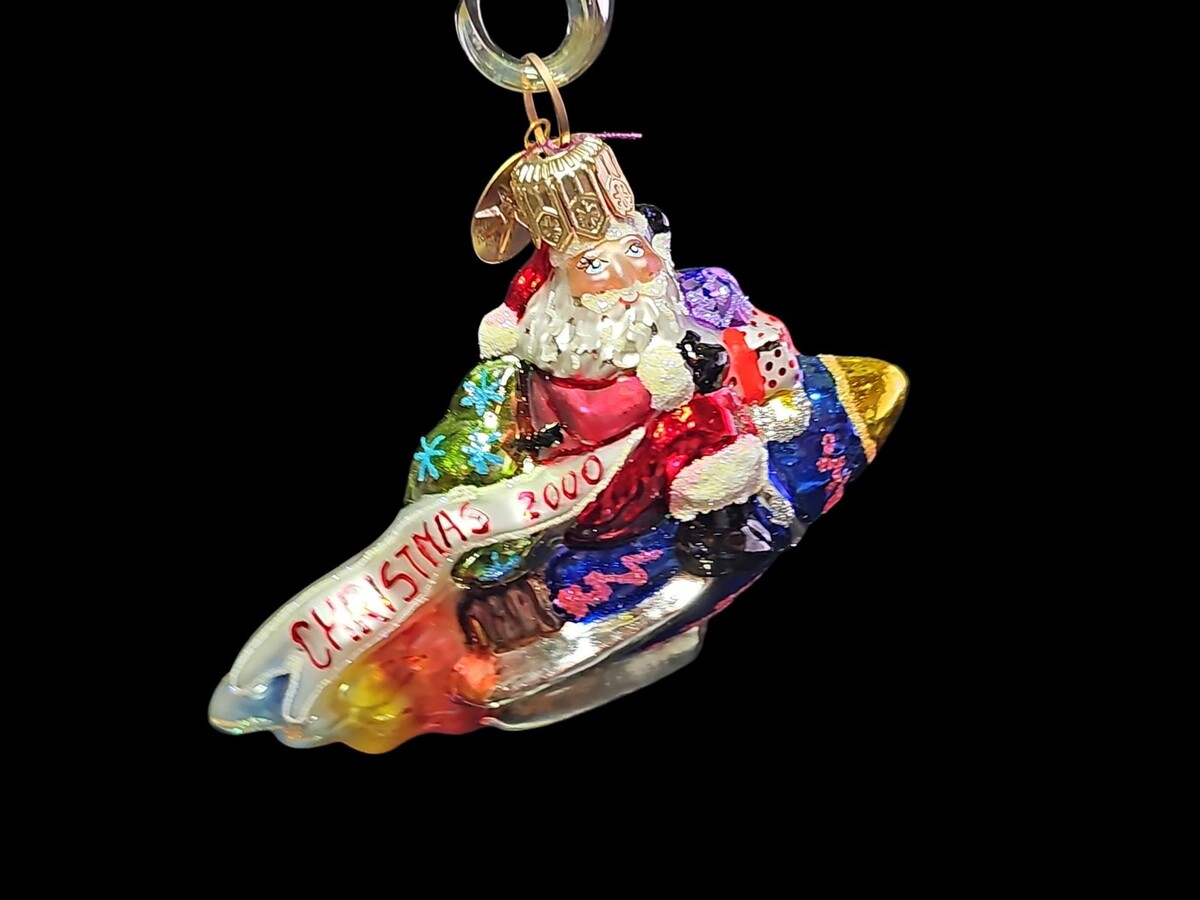 Christopher Radko Little Gems ?Millennium Blast Off? ornament, 2000. Style number 00-519-0. Features Santa riding a rainbow rocket with ?Christmas 2000? banner. Part of the miniature Little Gems line. Highly detailed and colorful, approx. 3.25" tall. Comes with original tag