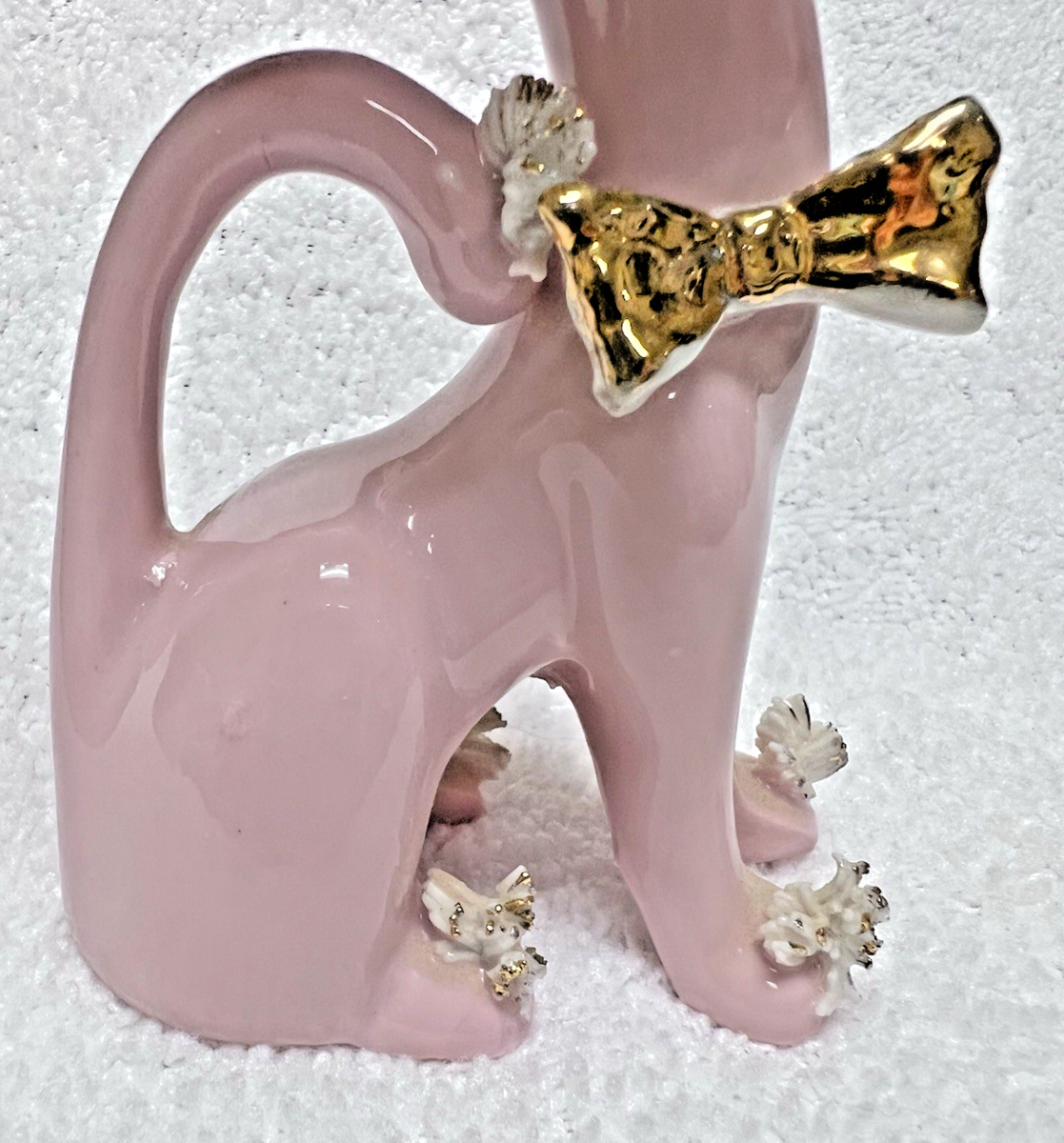 Mid-Century Pink Cat Kitten Spaghetti Whiskers & Toes Gold Bowtie 5.5" Tall