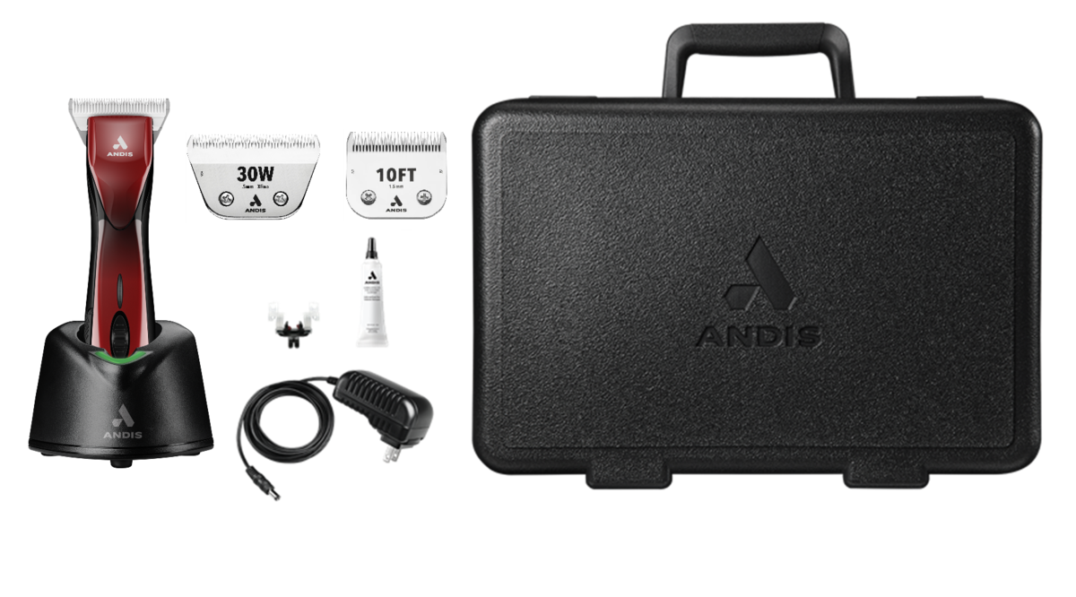 Kit Includes clipper, Lithium Ion Battery Packs, charging stand, automatic universal transformer, additional blade drive, #30W Wide Andis CeramicEdge blade, #10FT Andis CeramicEdge blade (an added $30.99 value), heavy duty storage/carry case, blade oil, warranty and instruction manual.