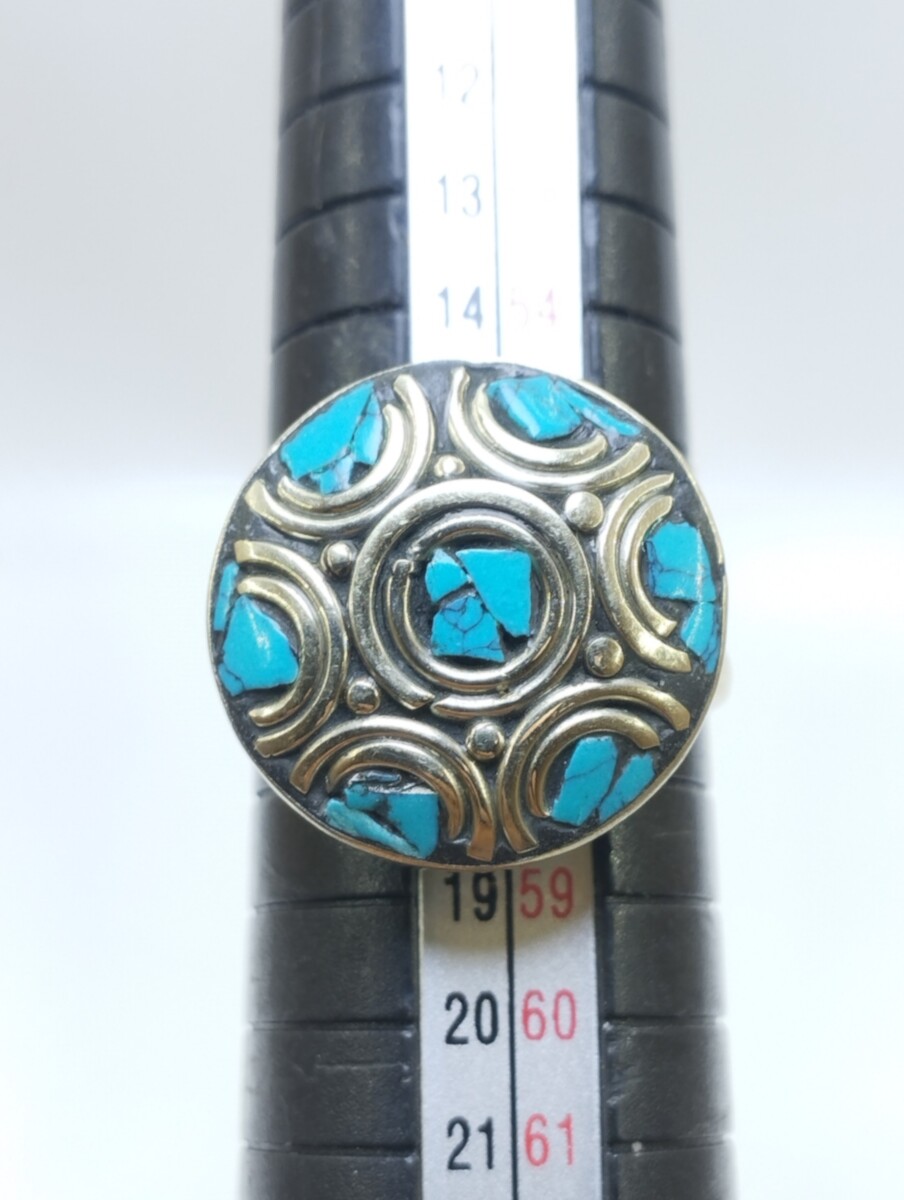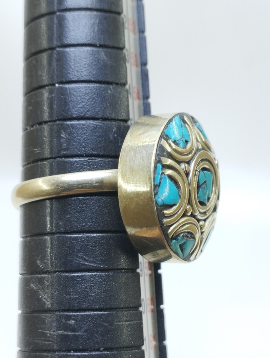 Vintage Tuareg Brass Turquoise Inlay Ring – Handmade Boho Statement Jewelry