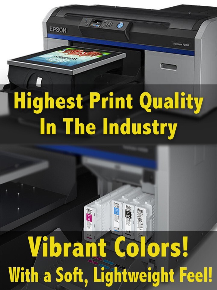 Our DTG (Direct To Garment) process utilizes next-generation printing technology that produces high-quality crisp designs. The inks are durable, vibrant, and eco-safe. Every shirt is Pre-Treated with our state-of-the-art pretreatment machine. This means more vibrant colors, with more solid, richer looking dark colors. It also enhances your image detail and prevents color fading after washing and drying.