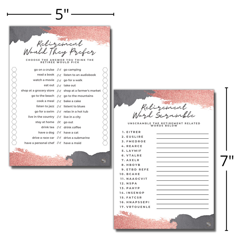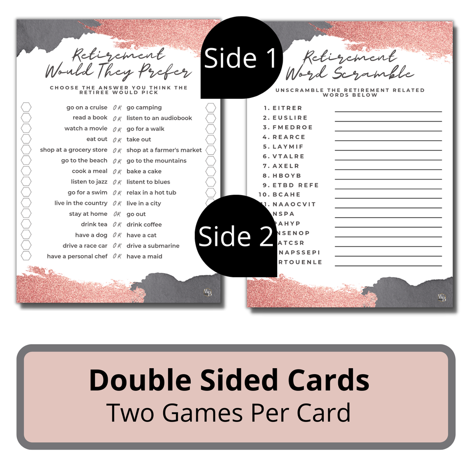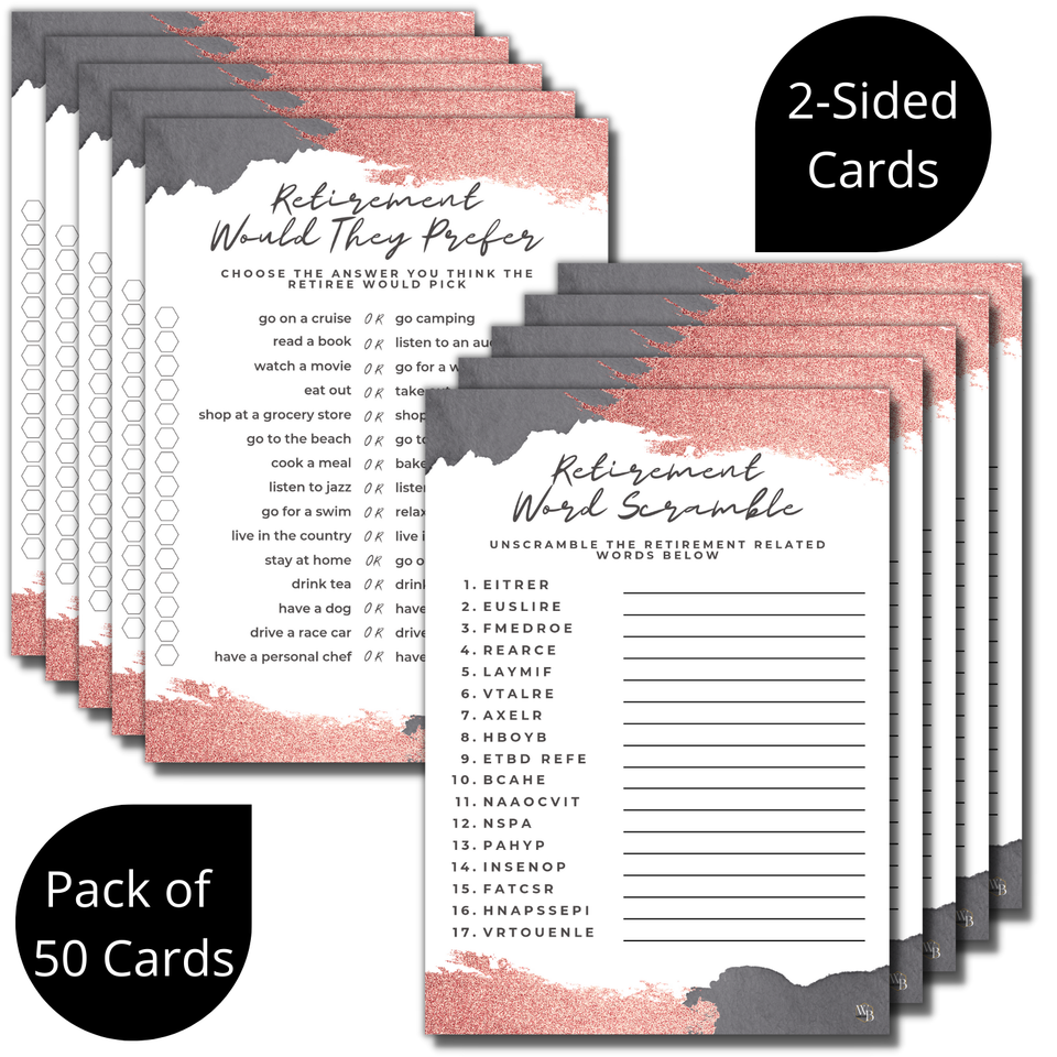 You will receive fifty (50) double sided matte textured cards. Great quality and easy to use and keep. 50 Retirement Games Cards - Happy retirement party game for women including: Retirement Word Scramble and Retirement Quiz Would They Prefer? Retirement party supplies for adults matches any rose gold retirement invitations or retiree advice cards. Double Sided Cards - Retirement party bundle is 2 games per card, one on each side. Same fun, less paper. Rose gold women's retirement party favors and decorations are the perfect addition to your retirement party games. A fun ladies party ideas is made in USA and copyrighted design registered by WillaBees.