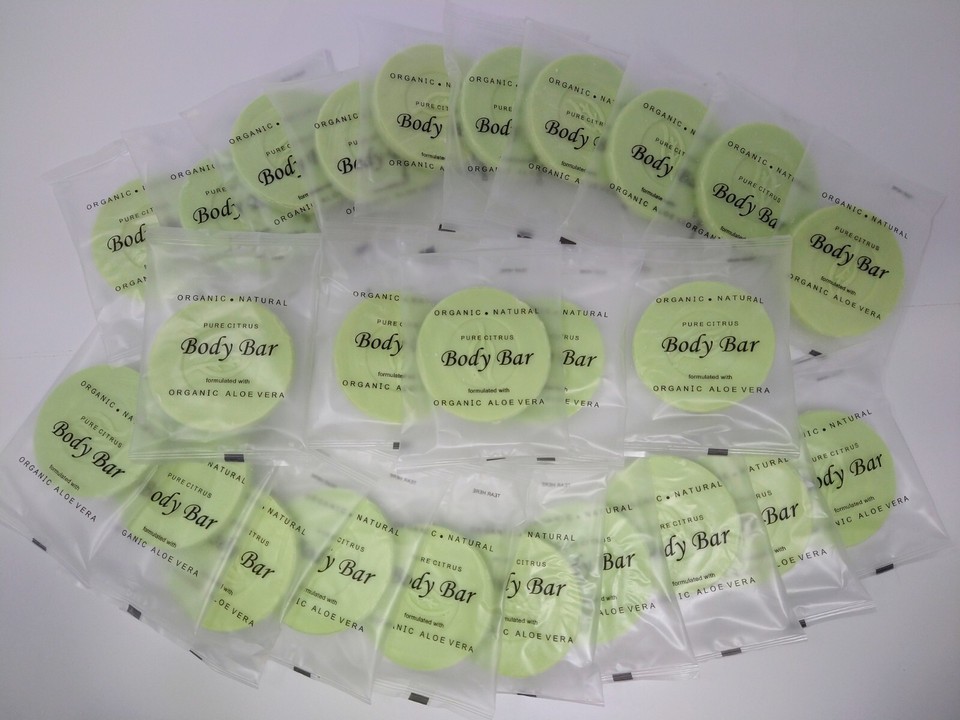 Each 1.5 oz. body bar is individually wrapped in an elegant clear sachet pouch and is 100% biodegradable. The product is packaged in lots of 25 bars each.