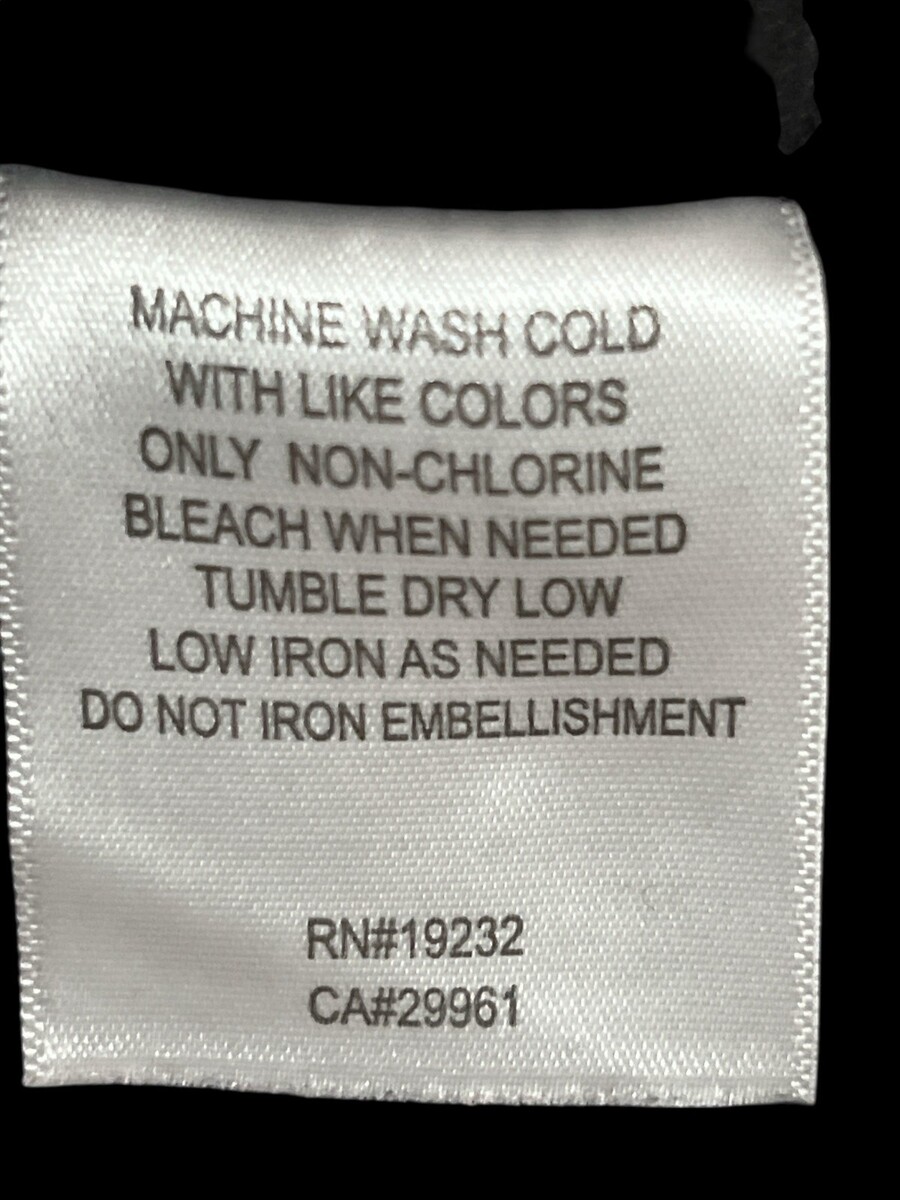 Machine wash cold with like colors; tumble dry low. Do not iron embellishments.