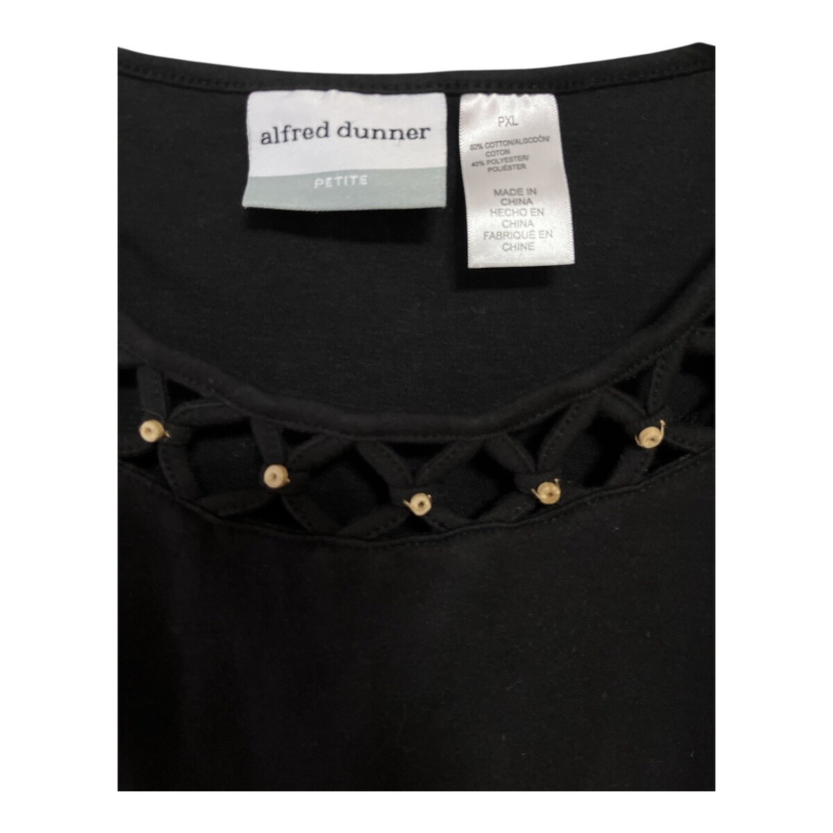 A stylish **Alfred Dunner Petite XL women?s short sleeve top** in black, featuring a decorative **lattice-style collar accented with small natural wooden beads**. Crafted from a soft cotton-polyester blend, this top combines comfort and subtle elegance ? perfect for casual outings or evening wear.