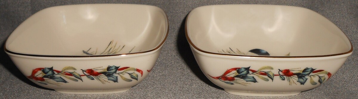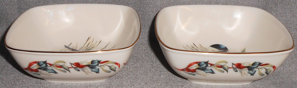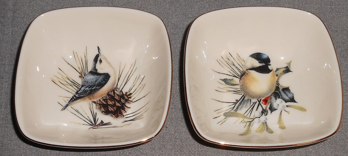 This is a Set of (2) 4 1/8" Sauce Dip Bowls from Lenox in the Holiday - Christmas Themed Winter Greetings Pattern with the Nuthatch and Chickadee Birds. They are both in good pre-owned condition with no chips or cracks.