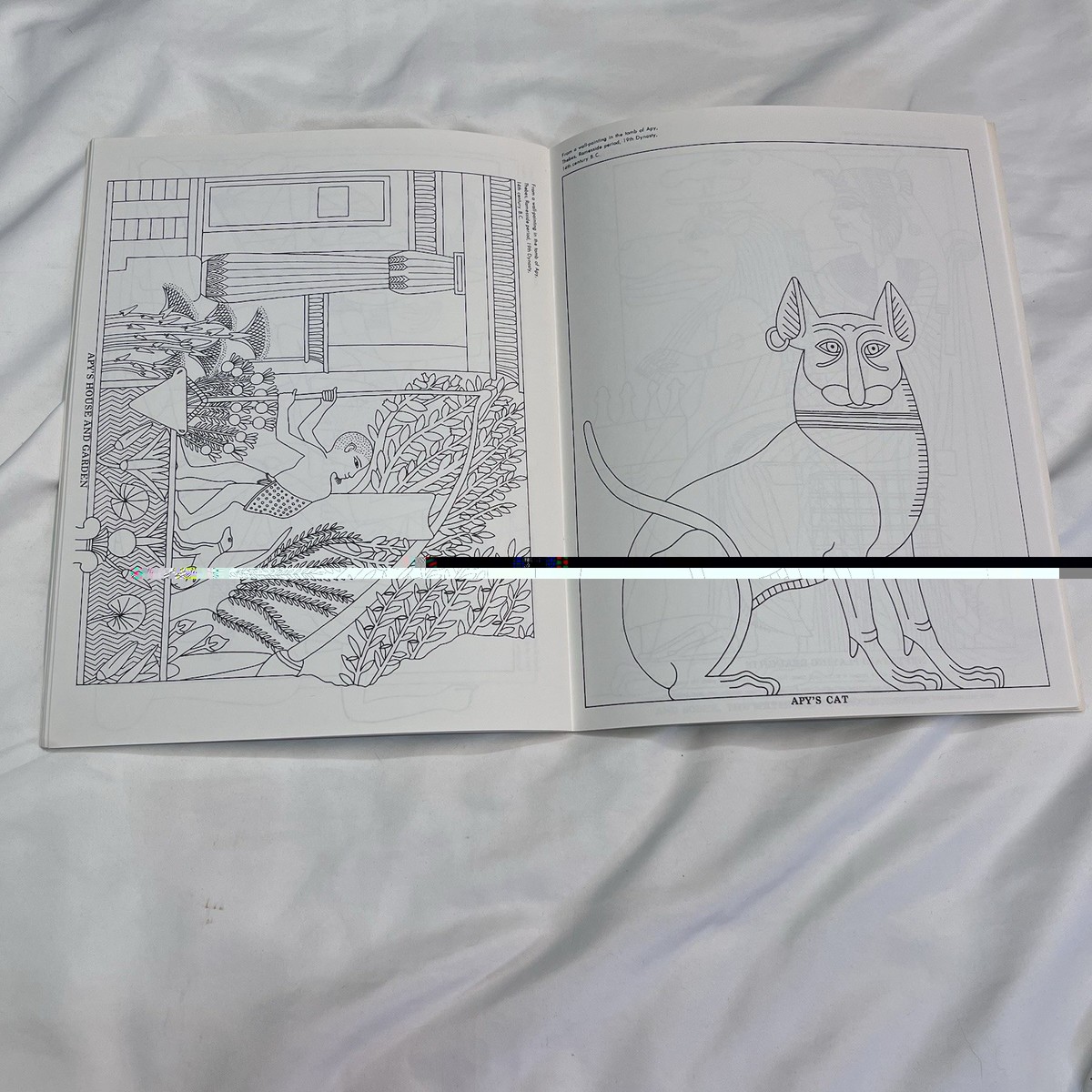 Vintage ?A Coloring Book of Ancient Egypt? published by Bellerophon Books, featuring authentic ancient Egyptian artwork adapted for coloring. Includes detailed line drawings inspired by original wall paintings, carvings, and artifacts ? each paired with captions explaining their historical or mythological context.