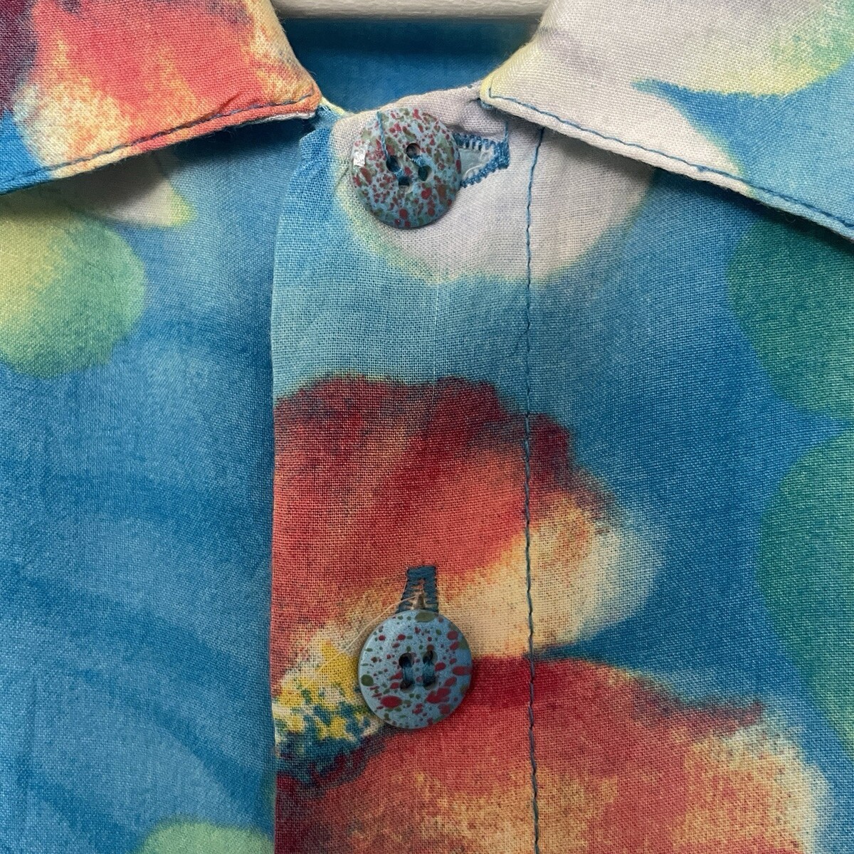 The product is a Jams World Hawaiian shirt for men in size M. It features a bold floral pattern. Colors are shades of blue,. Shirt has short sleeves and colorful button accents. Made of rayon fabric, this vintage shirt has a regular fit and is perfect for summer and spring.