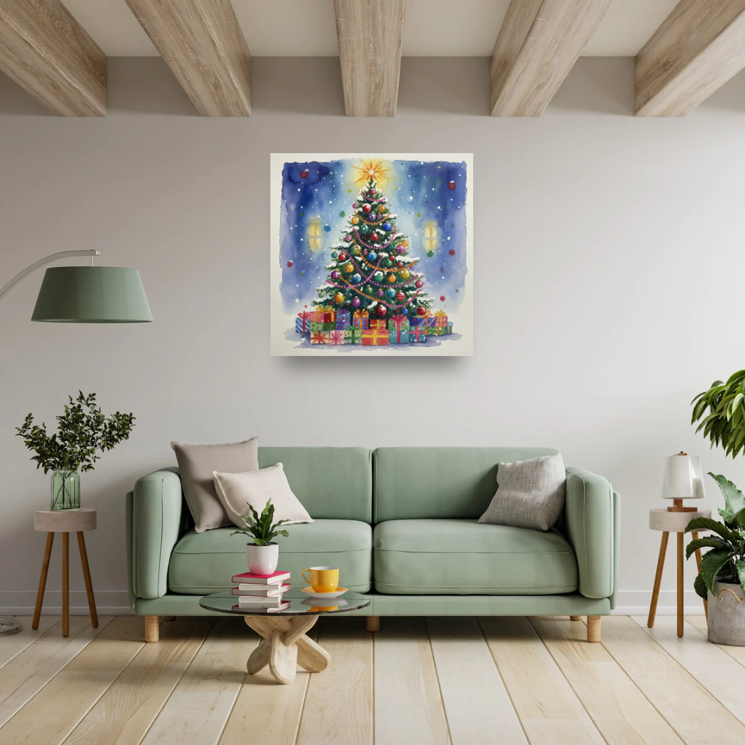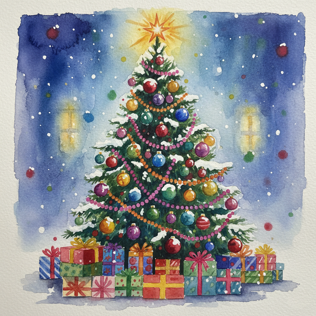 This is a vibrant watercolor painting of a snow-dusted, fully decorated Christmas tree under a glowing star. The tree is adorned with colorful ornaments and bright string lights. A large pile of festively wrapped presents rests at its base, all set against a dark blue, snowy night background with a soft light coming from windows in the distance.