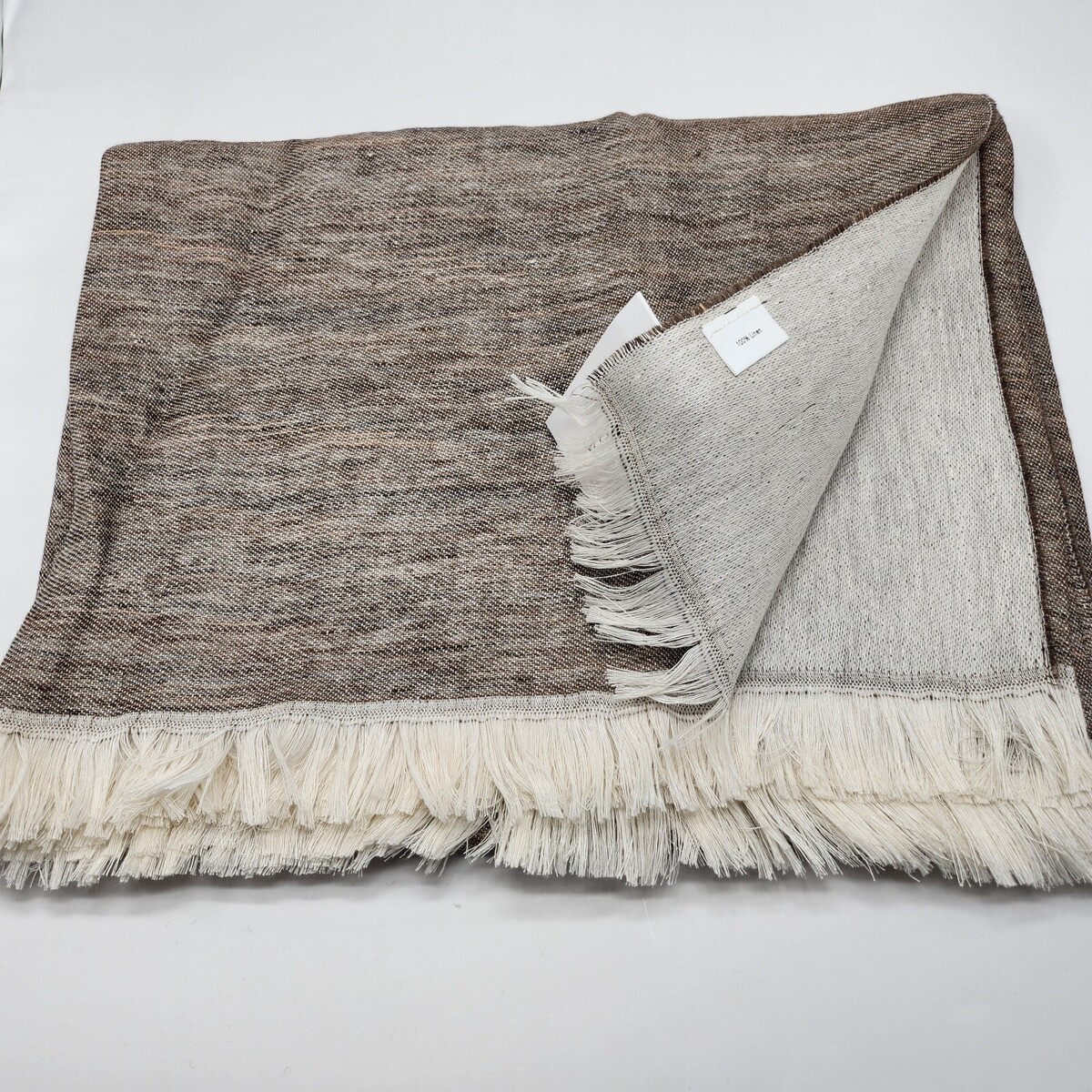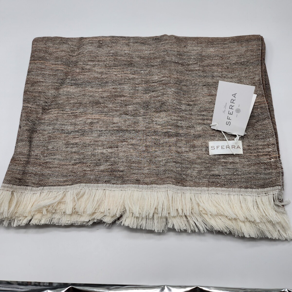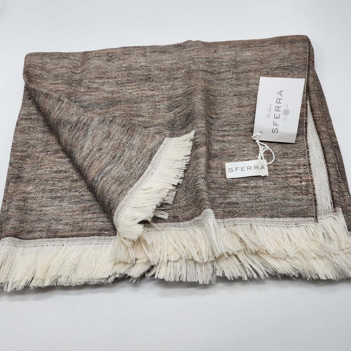Sferra Taupe Linen Throw Blanket Fringed Woven Linear Design Oversized Italy NEW