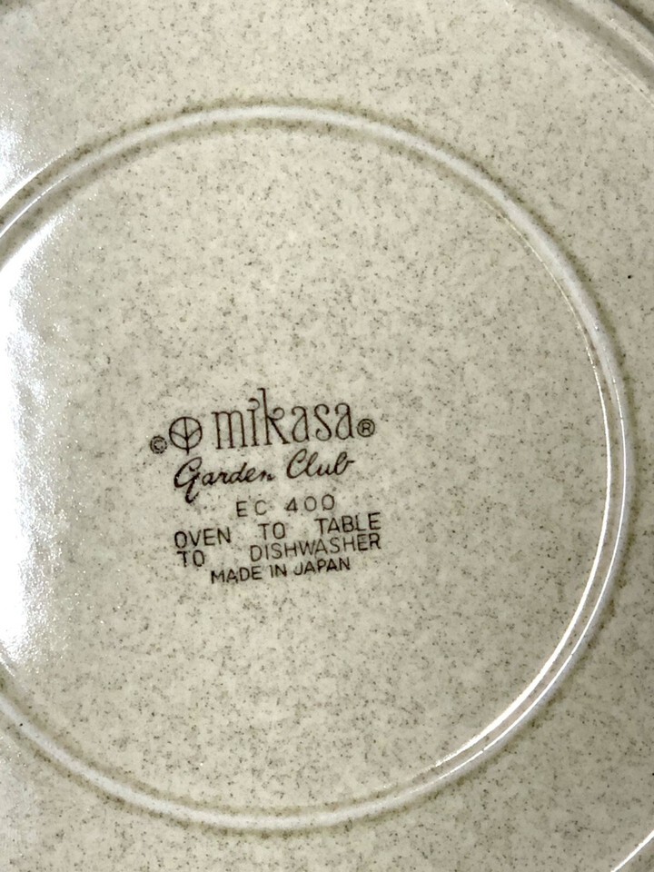 This is a vintage Mikasa Garden Club Wheat EC 400 round platter from the 1970s. The platter is made of multicolor stoneware and features a retro design with a printed backstamp. It is a 12-inch serving plate produced in the style of art pottery, showcasing a round shape and a nostalgic 70s aesthetic.