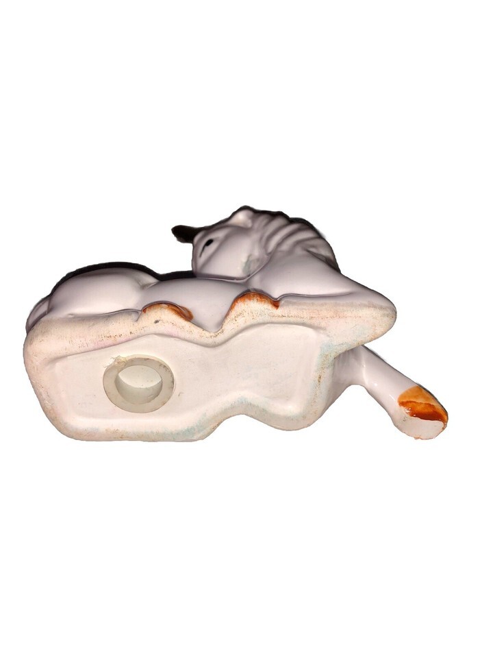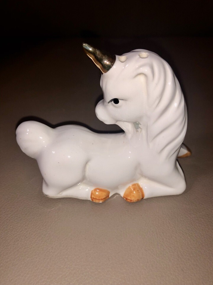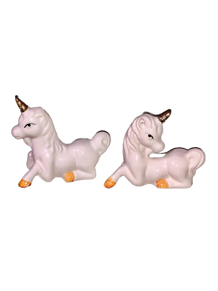 This product is a set of vintage ceramic salt and pepper shakers in the shape of laying down unicorns, featuring white gold accents. The novelty shakers have stoppers and are designed in a fantasy theme, making them a unique addition to any collection of kitchen tools and gadgets. Measuring 3.5 inches in length and height, these small multicolor shakers from the 1970s are originally manufactured in Taiwan. Perfect for all occasions, this set includes a pepper shaker and salt shaker with a whimsical animal pattern that is sure to bring a touch of nostalgia to any dining table.