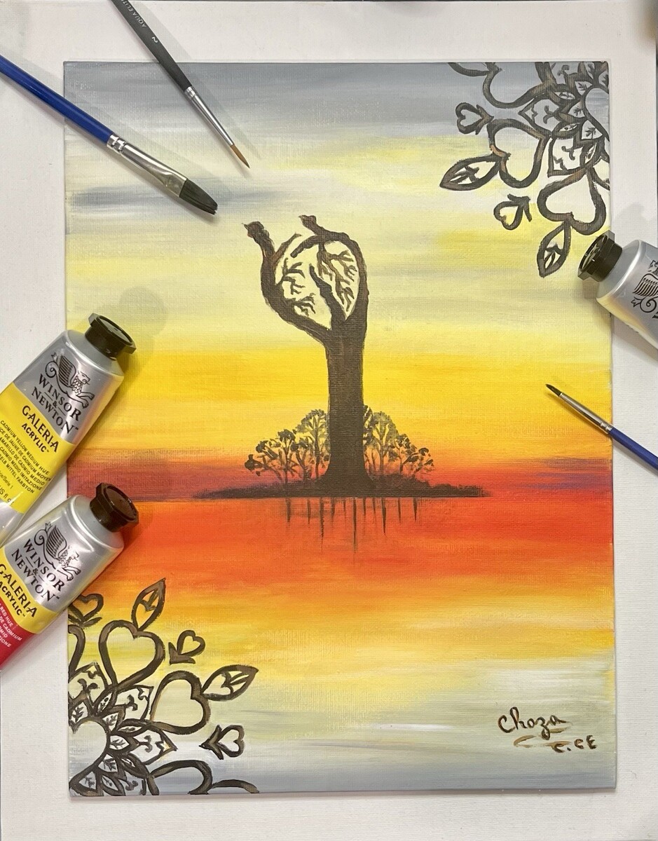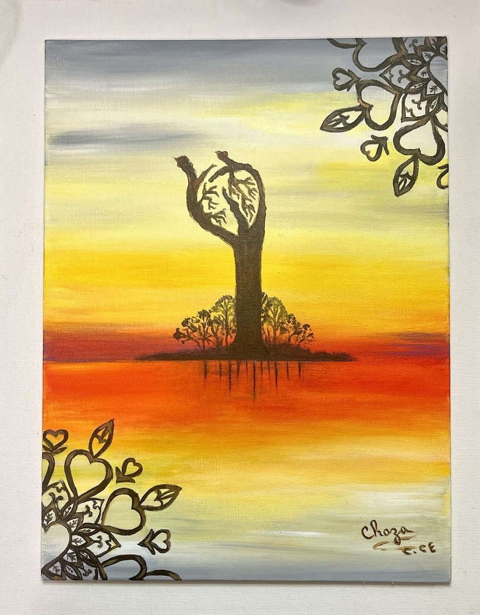 ?Beating Heart? is an original acrylic painting. It's a surrealistic landscape that depicts a tree dancing in the wind in the form of a human heart, a representation of the unity of nature and humanity.