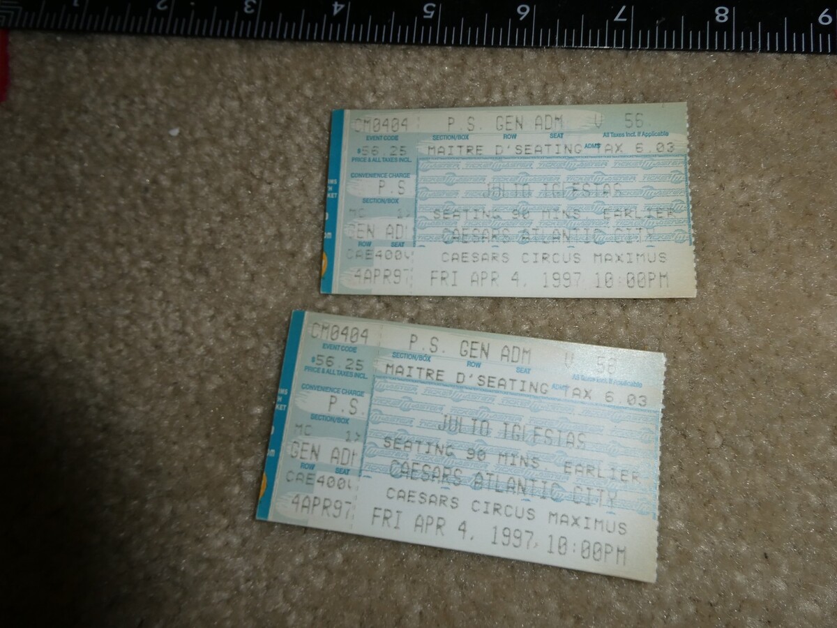 are bidding on a nice, original lot of 2 old concert ticket stubs, April 4 1997 at Caesars in Atlantic City for Julio Iglasias, in the picture. Very good shape, general wear, a few creases, some yellowing as shown. Zoom in for condition.