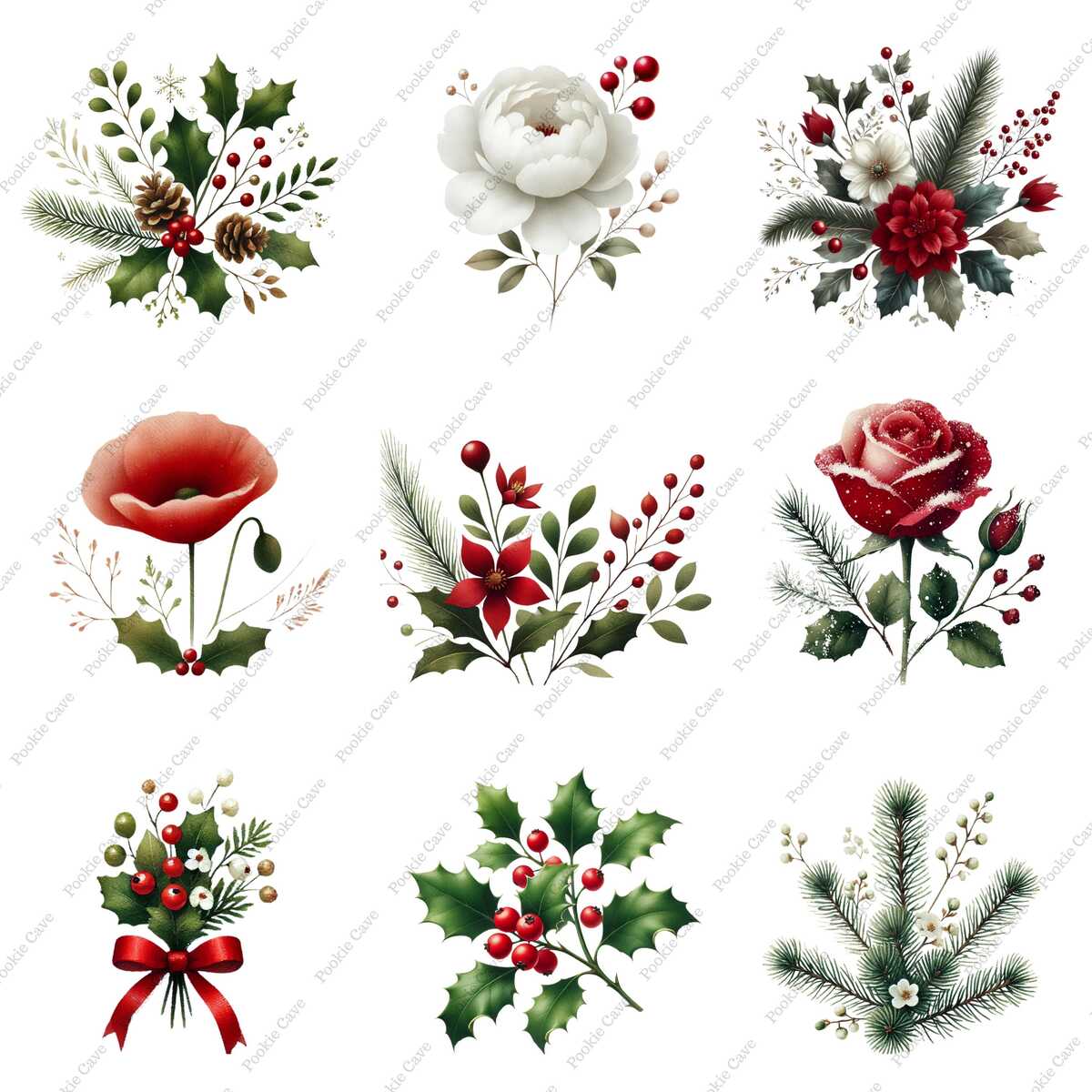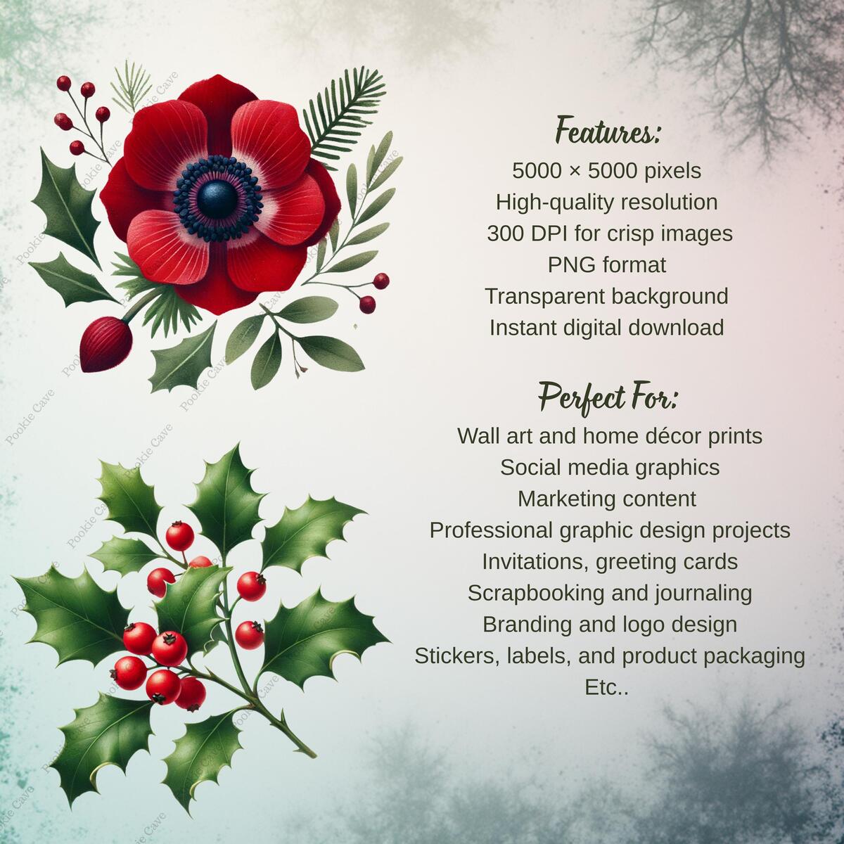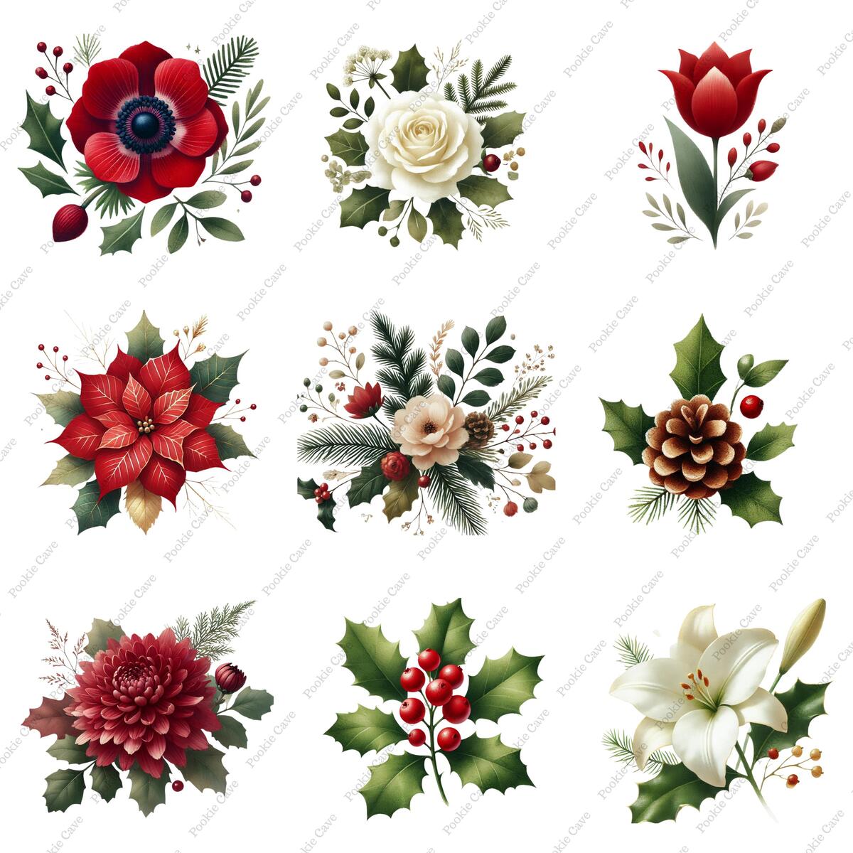 Celebrate the season with this bundle of 24 Christmas florals! This collection features elegant winter blooms like poinsettias, roses, holly sprigs, pinecones, and seasonal greenery — perfect for holiday designs, stationery, branding, sublimation, and more.