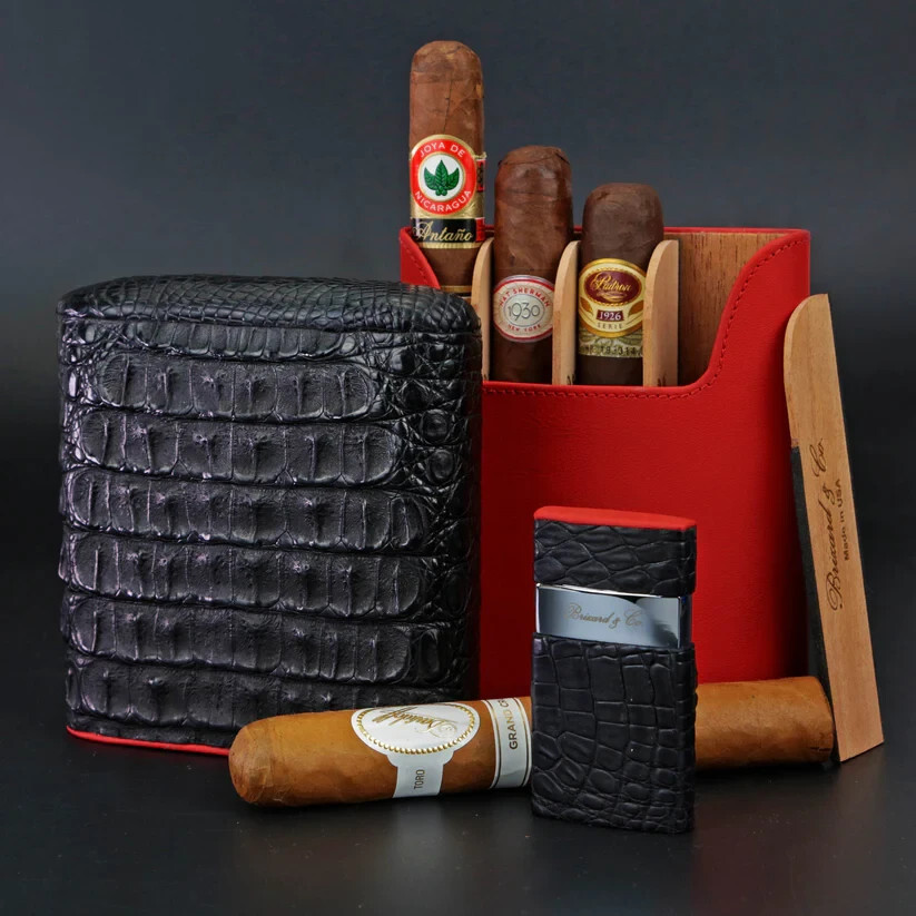 The Show Band 5 cigar case is a luxurious and high-quality product made in the United States. It features a sleek black caiman alligator and red leather design, adding a touch of elegance to any cigar enthusiast's collection. The added bonus of a lighter included in the set makes it convenient for on-the-go smokers. Handmade with attention to detail, this cigar case is a must-have for those who appreciate fine craftsmanship and style.