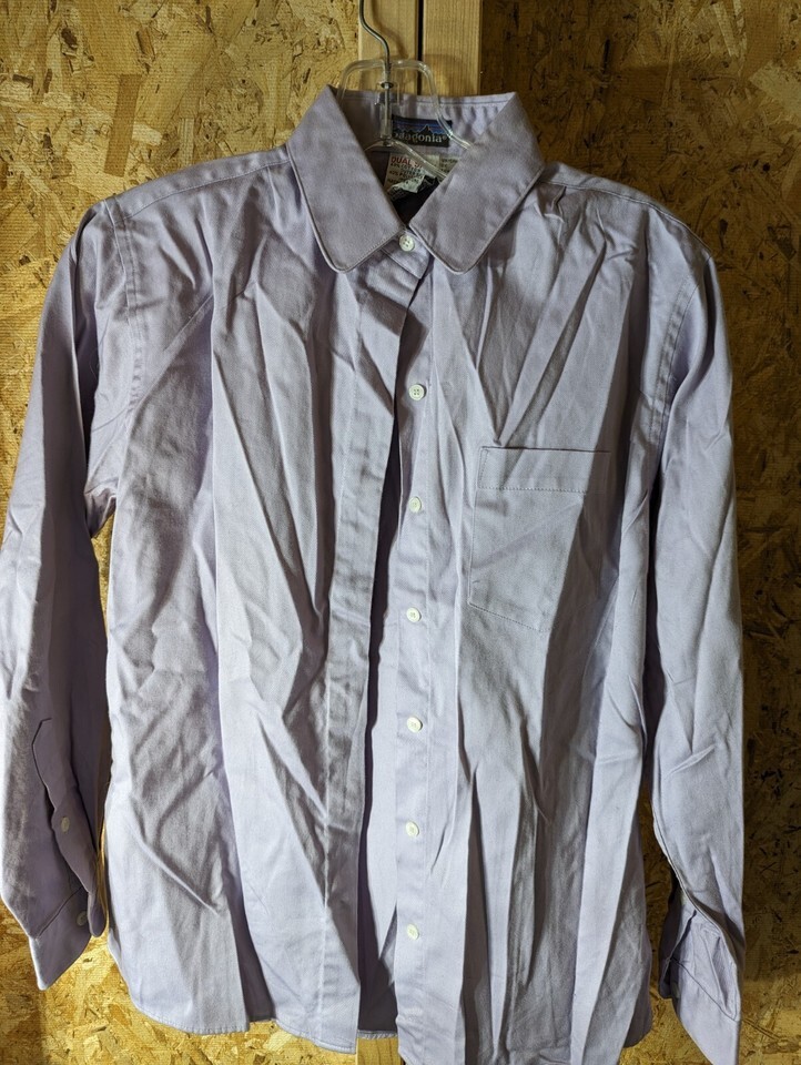 Patagonia denim button-up shirt for women in size 8. The shirt features a solid lavender color, collared neckline, and long sleeves. It is made of a polyester-cotton blend and is machine washable. The shirt has pockets and a button closure. The fabric type is denim and the brand is Patagonia.