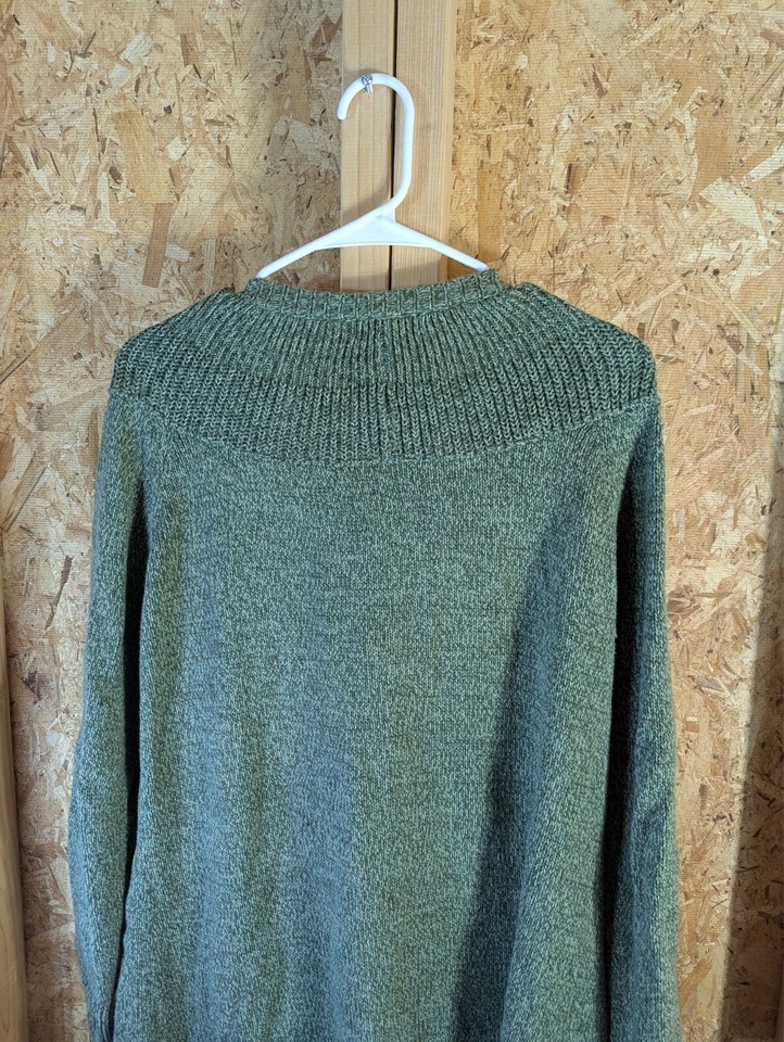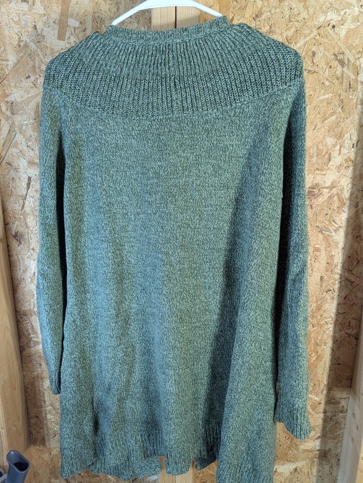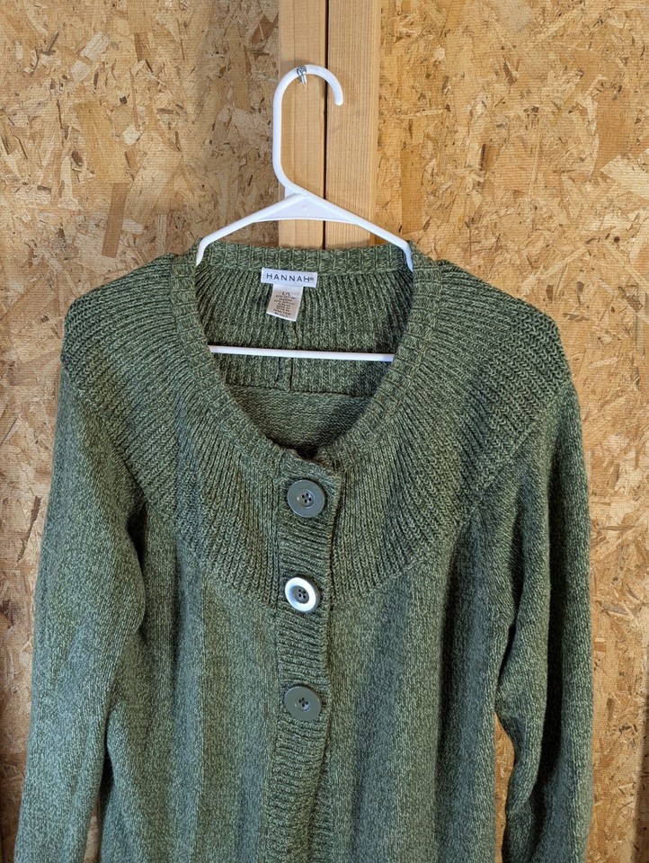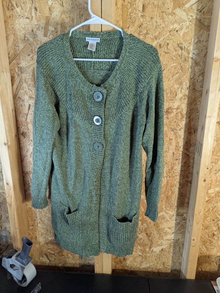 This is a green cotton cardigan for women by the brand HANNAH in size large. It features a tight-knit solid pattern with a crew neck and long sleeves. The cardigan has three button accents, collarless design, and pockets. It is machine washable and suitable for winter, fall, and spring seasons. Made in China.
