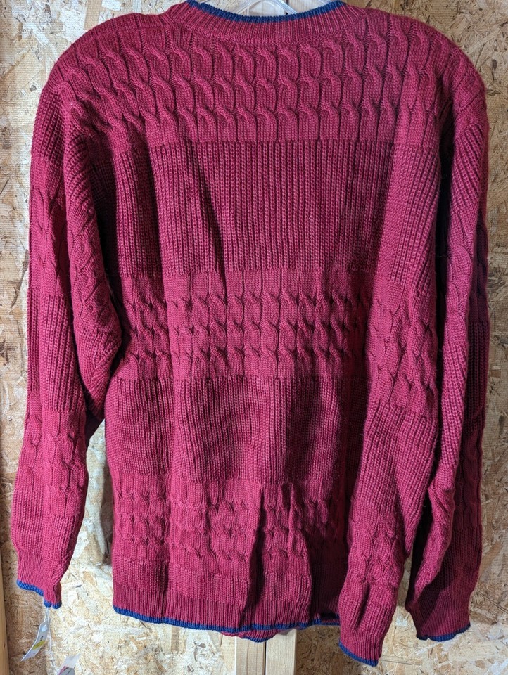This is a red, cable-knit cardigan sweater made of lightweight acrylic fabric. It has a V-neckline, long sleeves, and shoulder pads. The sweater features pockets and is machine washable. The brand is 100% and it has a vintage style. The sweater is designed for women and comes in a regular size medium. It has a Country theme and was manufactured in Hong Kong.