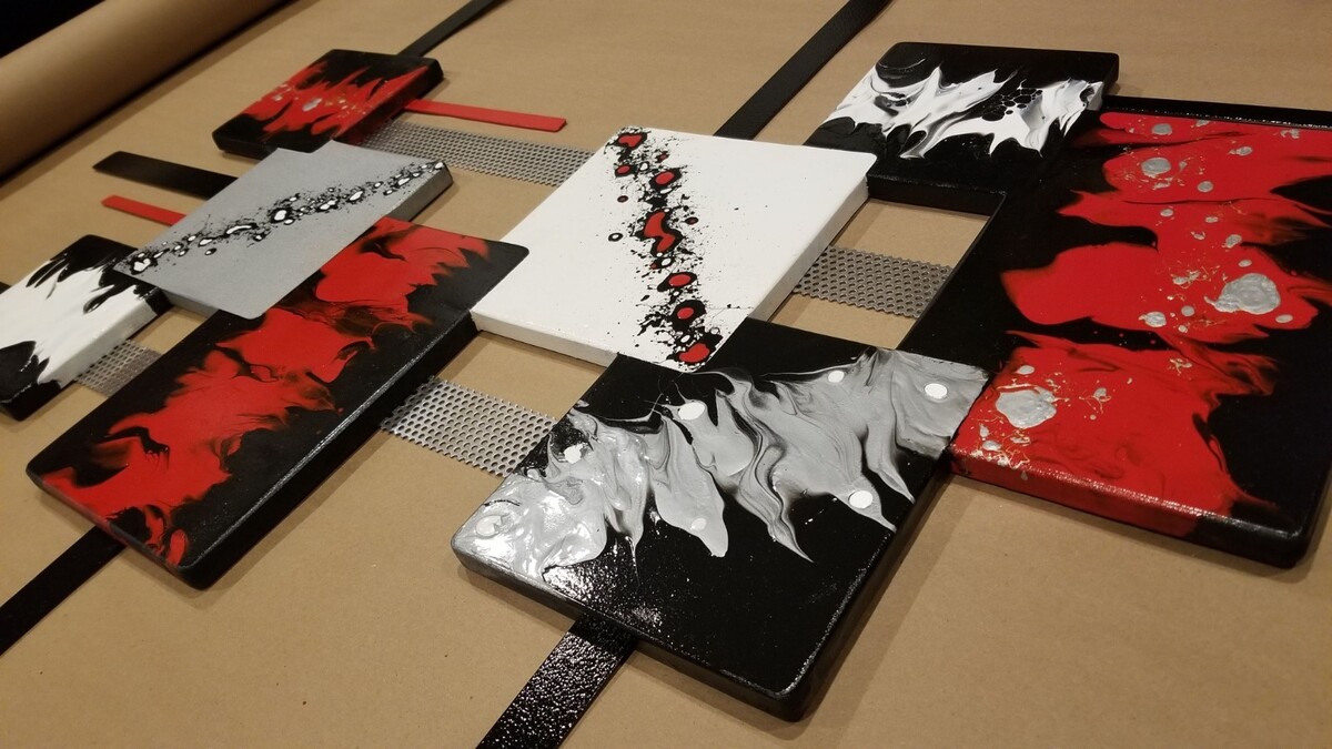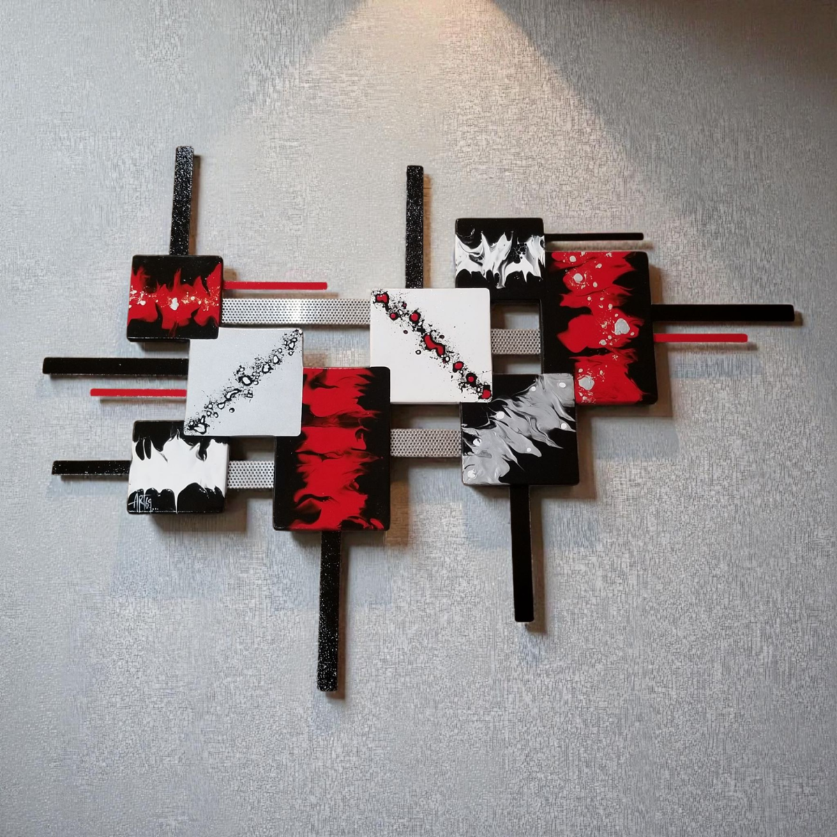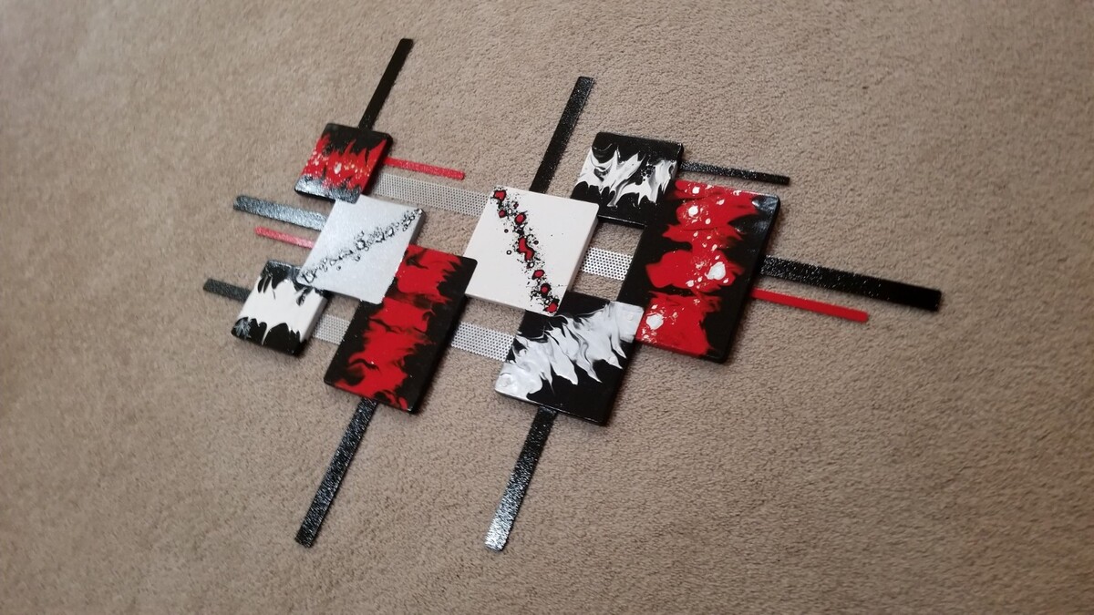 red, black, white metallic silver. The Wooden squares feature abstract painting, and
