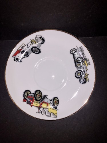This product is a vintage Princess House porcelain cup and saucer set featuring an antique cars pattern. The set includes four pieces: a tea cup, cup saucer set. Made of fine porcelain with a decorative style, the cup and saucer are designed with a round shape and multi-color pattern. The vintage set is from the 1980s and showcases a unique theme of cars, making it a special and collectible addition for car enthusiasts or Princess House collectors. Made in Japan, this original production set is a timeless piece for all occasions.