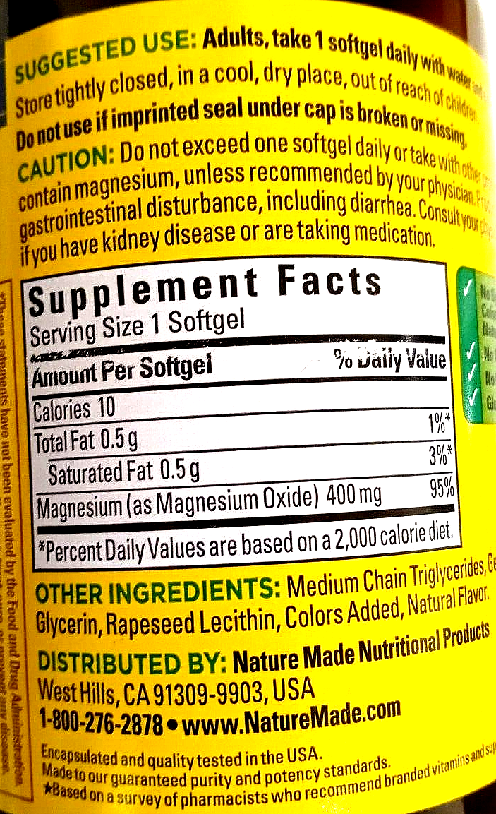 Nature Made Extra Strength Magnesium 400 mg 180 Softgels EXP 08/2026