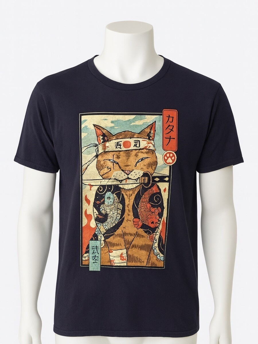 Threadless graphic tee featuring the popular samurai cat artwork by Vincent Trinidad. Black short-sleeve shirt with a bold illustrated cat warrior design inspired by Japanese-style prints. Soft 100% cotton fabric and a relaxed unisex fit.