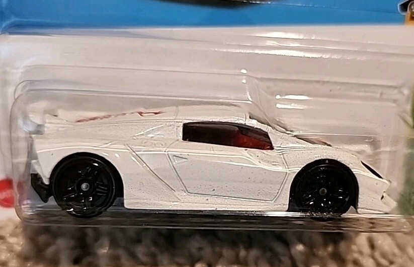 The Hot Wheels Lamborghini Sesto Elemento is a 1:64 scale diecast model from the EXOTICS series, featuring a sleek white color and detailed design. This collectible car is recommended for children aged 3 and above, appealing to both boys and girls who enjoy playing with cars. Manufactured in Malaysia in 2021, this miniature Lamborghini showcases the brand's iconic style and quality craftsmanship, making it a must-have for car enthusiasts and collectors alike. Bottom corners of the card are slightly bent and there is a small crease at the top of the card.