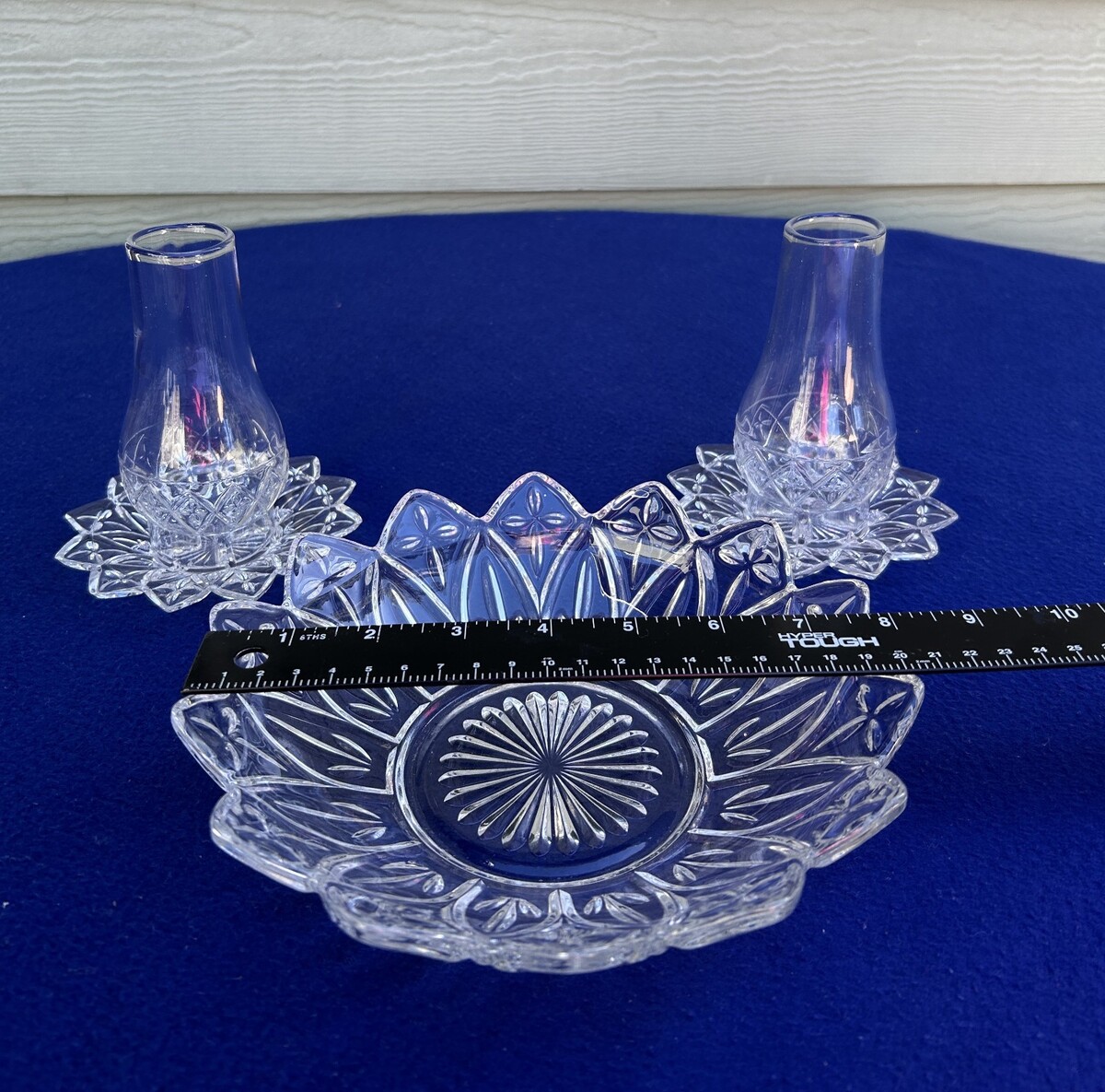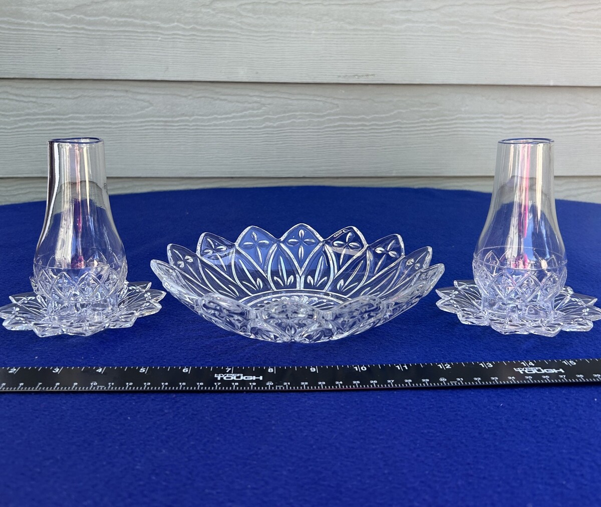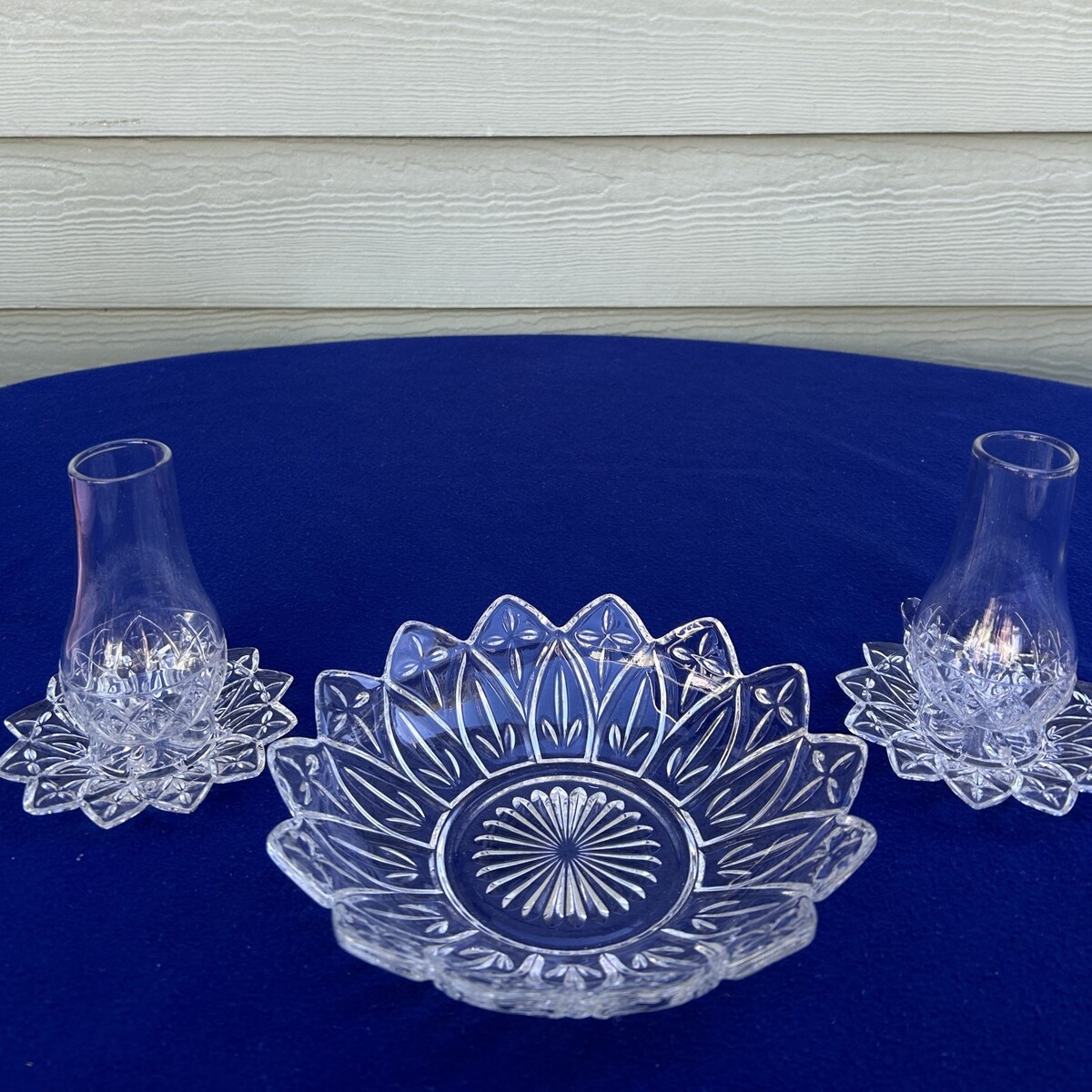 Vtg Federal Glass Petal clear 2 sm votive candle lanterns & 8" bowl console set
