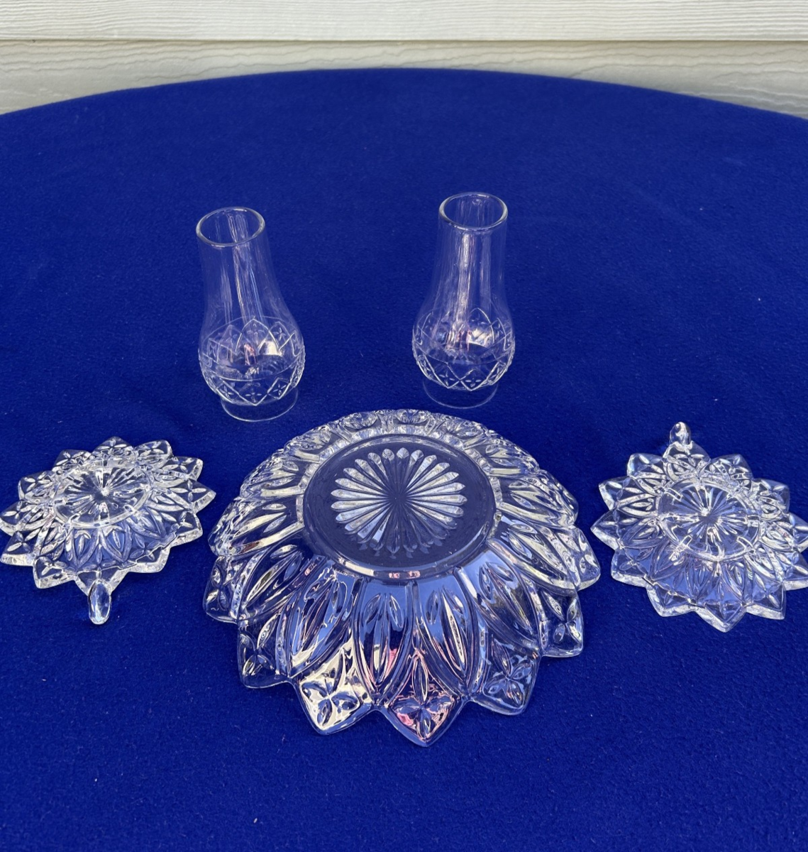 Federal Glass Petal console display set, including an 8 3/8" bowl and two votive candle lanterns with chimneys. Bowl does have 1/4: scuff near the center, I have not tried to remove it though it may polish out. It has 14 points, the fairy lamp has 12 points and tiny little handle off of one the points. Very cute. See my other items in this pattern.