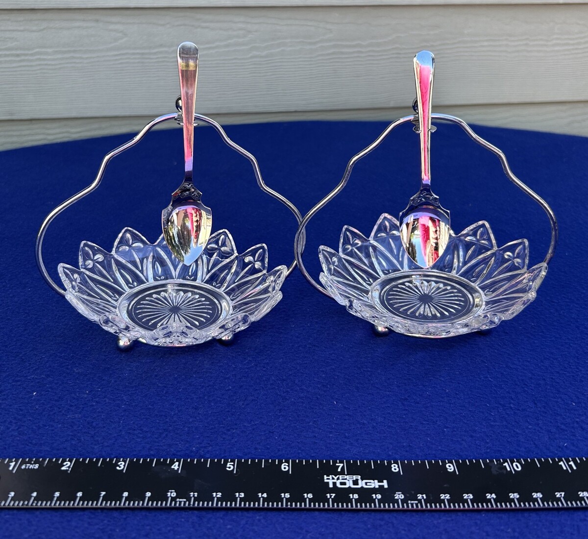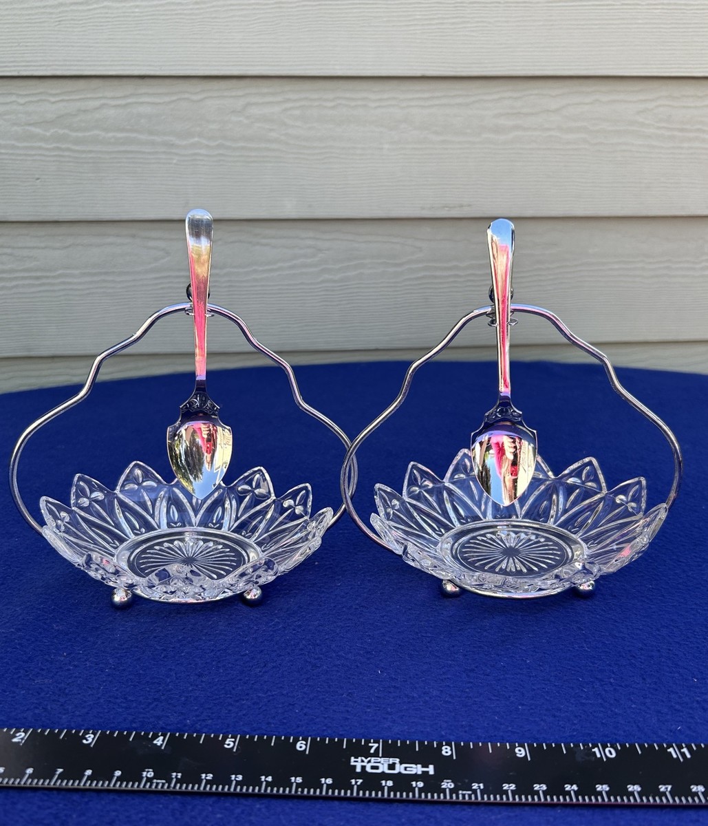 vtg Federal Glass pair clear Petal candy mint dishes in metal stands with spoons