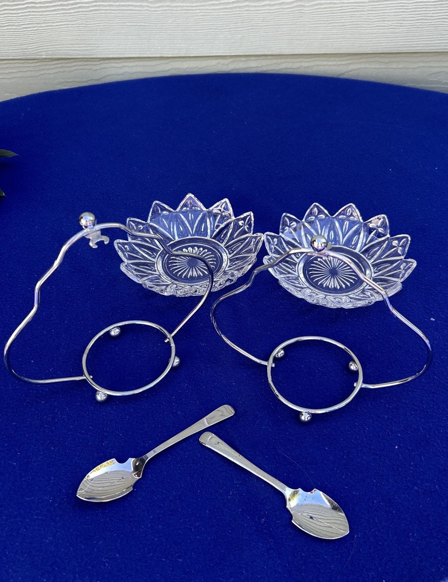 Federal Glass petal clear pair of candy/ relish dishes in a metal stand with attached spoon, set of two, the chrome is very good, the glass is perfect, no chips, scratches or sickness. Bowl is 5 3/4, stand 6", spoon, 5". See my other items in this pattern.