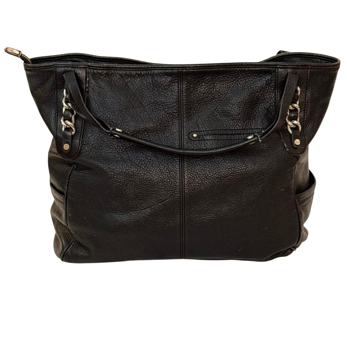 Classic and versatile ? B. Makowsky black genuine leather slouchy tote bag with silver-tone chain hardware and signature detailing. Spacious, soft leather body with plenty of organization inside and out, lined in leopard print fabric for a bold touch. A durable, everyday carryall with the right amount of edge.