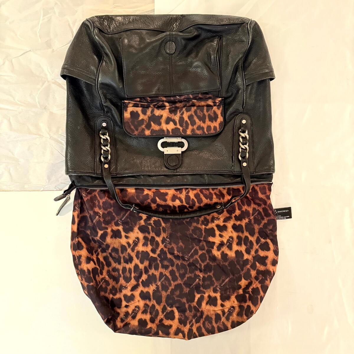 B. Makowsky Black Leather Slouchy Tote Bag Silver HW Chain Strap Leopard Lining