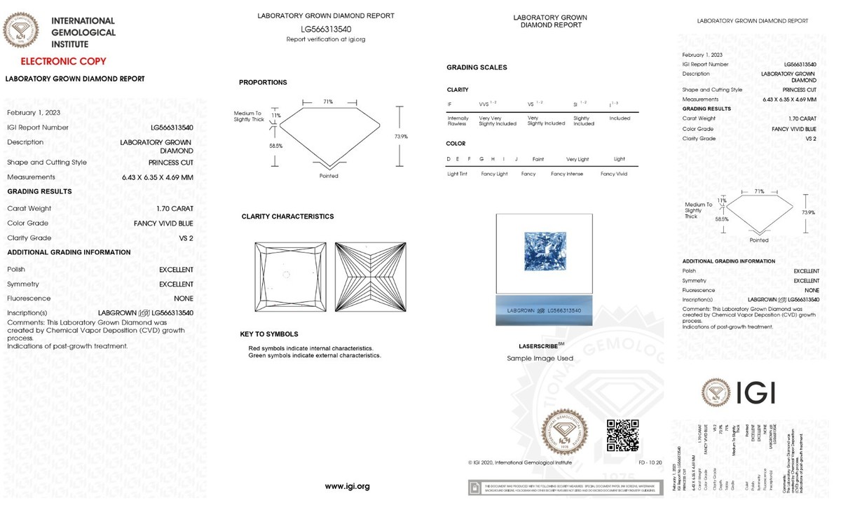 Blue PRINCESS Fancy Vivid Blue 1.70 Cts VS2 Lab Grown CVD Diamond for Ring